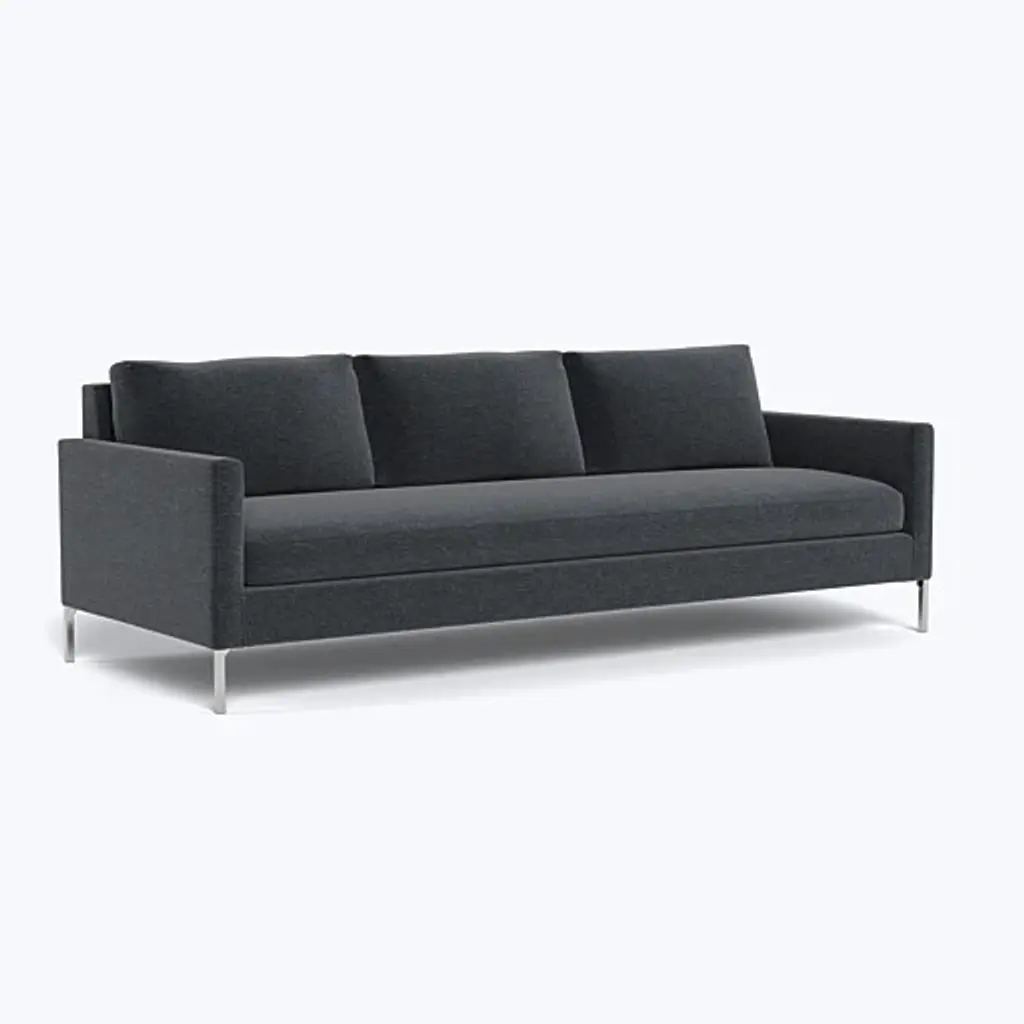 The 91" Soho Sofa, exclusively from ABC Carpet & Home, embodies the chic sophistication and modern elegance of New York’s trendy Soho neighborhood. Its sleek, low-profile design and spacious bench seat make it a standout centerpiece for any living room, adding an upscale touch to your home. Available with either brass or steel legs, the Soho Sofa offers a customizable look that complements a range of interior styles, from contemporary to modern. Built with sustainability in mind, the Soho Sofa is constructed on a durable, eco-conscious Goodwood frame. The cushion cores are made from eco-friendly foam derived from sustainable, plant-based materials and wrapped in a soft blend of feather and down, offering an unparalleled seating experience that balances comfort with firm support. This thoughtful combination ensures that the sofa is not only stylish but also incredibly comfortable for everyday lounging or entertaining guests. Choose from our in-stock fabrics or select from over 80+ custom fabric options. Whether you opt for bold jewel-tone velvets like Vance to create a striking focal point, durable performance fabrics for pet- and family-friendly use, or elevate the design with Libico linen for a sleek, refined look, this sofa can be tailored to your specific style and needs. Handcrafted to perfection, the Soho Sofa will be delivered to your home within 8-10 weeks, providing a seamless, high-quality experience from start to finish. Designed to fit effortlessly into a variety of living spaces, the 91" Soho Sofa is ideal for those who value both style and practicality. Its clean lines, generous seating, and customizable features make it a versatile piece that works equally well in large, open living rooms or more intimate spaces. Complete the look by pairing the 91" Soho Sofa with other pieces from the Soho collection, such as the lounge chair or the 64" loveseat. The collection offers endless possibilities for creating a cohesive, modern living area that reflects your personal style and delivers the ultimate in comfort and design