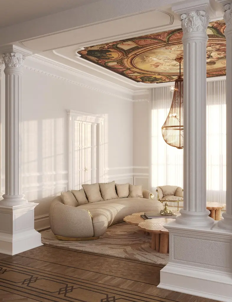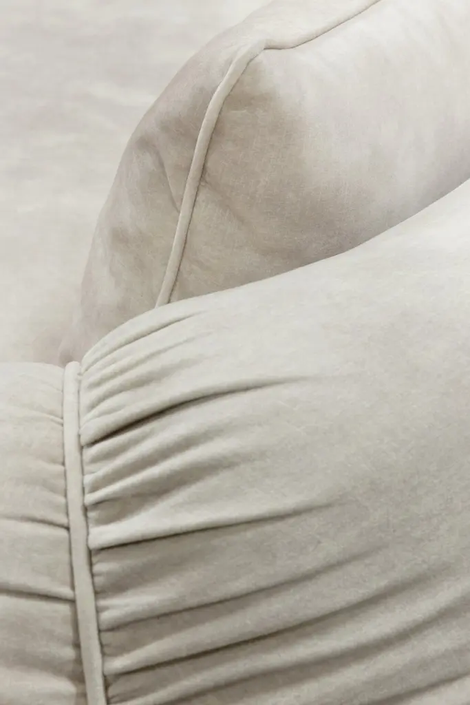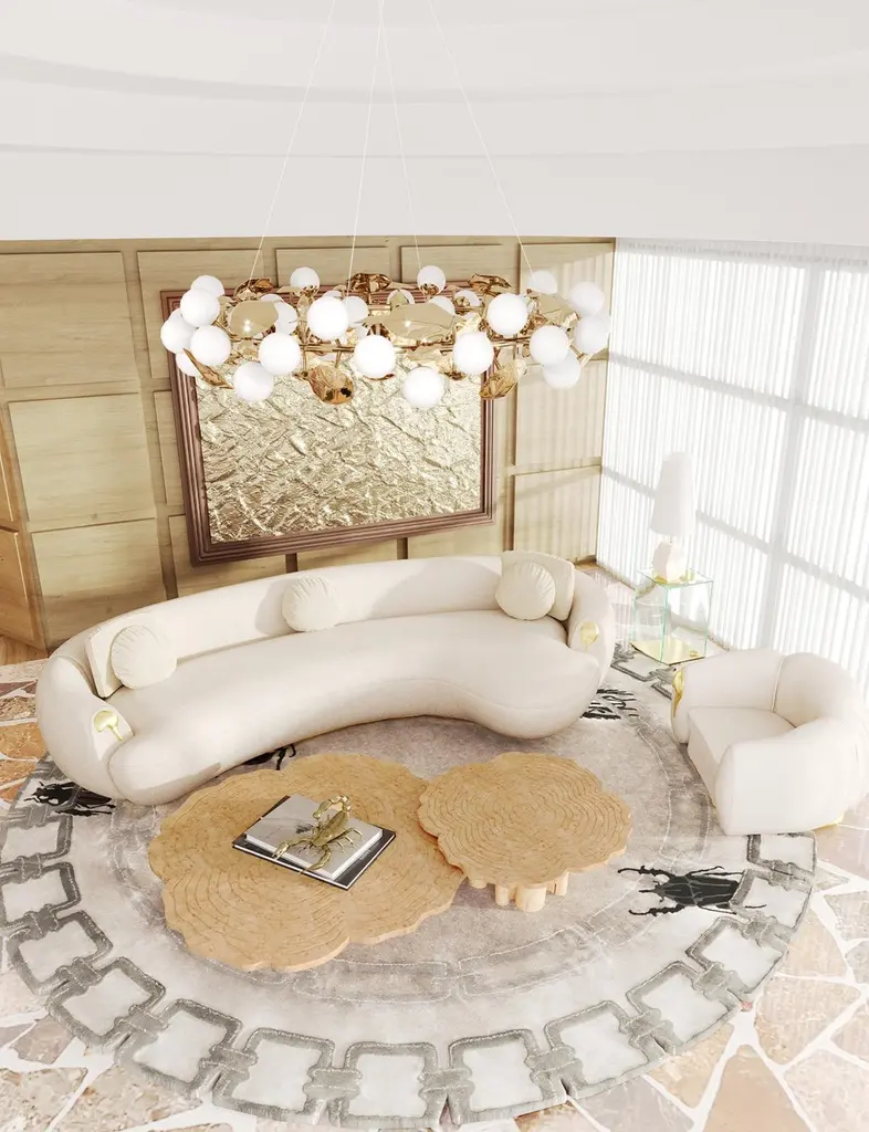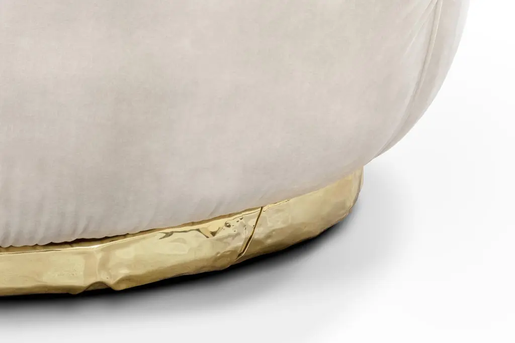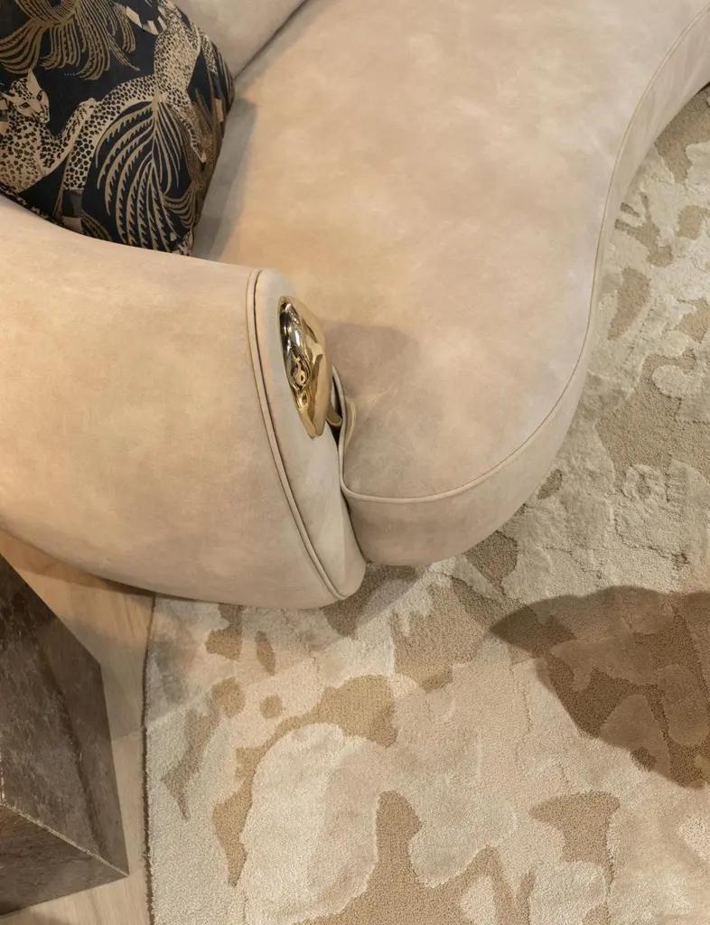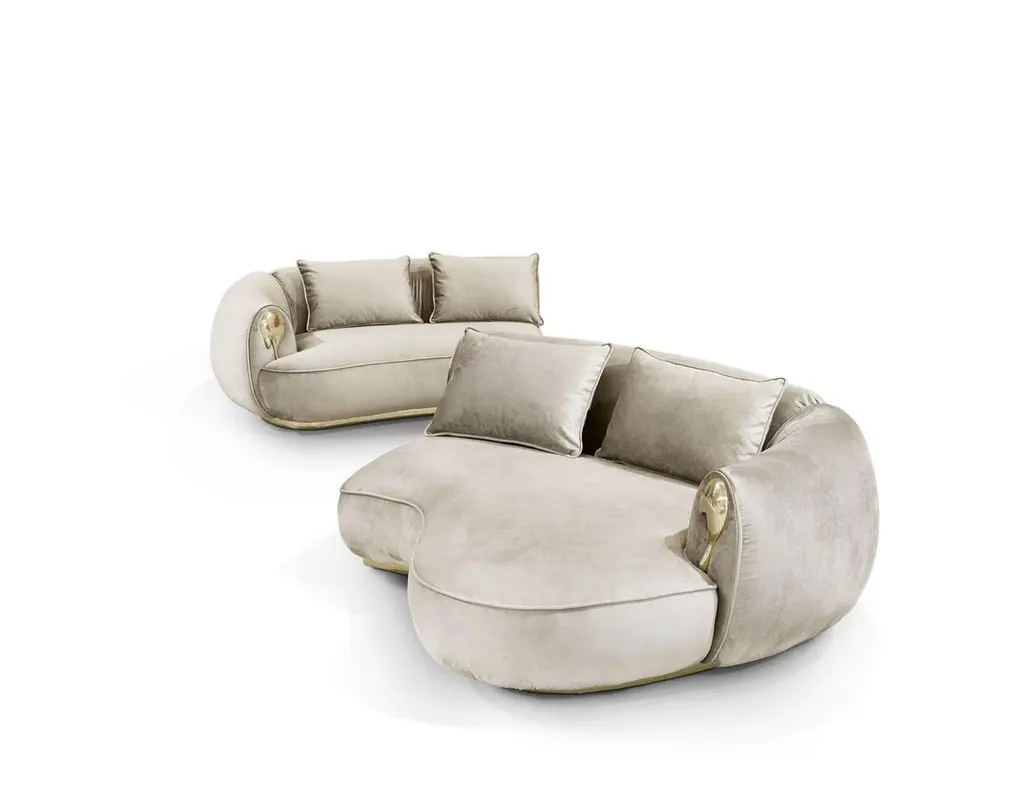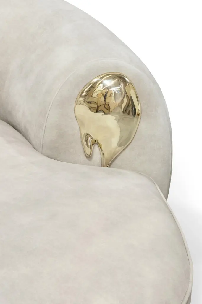 Inspired by the spirit and mission of the famous Cirque de Soleil, the Soleil Curved Sofa is a synthesis of styles and senses. Proving that its playful lines can also translate to absolute sophistication, this elegant curved sofa with creamy upholstery embrace a perfect combination between a vintage and a contemporary design to provide a sumptuous option for any modern day room. It features a double-part configuration that offers a multitude of seating without interrupting the flow of the space with individual punctuations. The brass details also perfectly complement the elegant lines of this timeless piece.