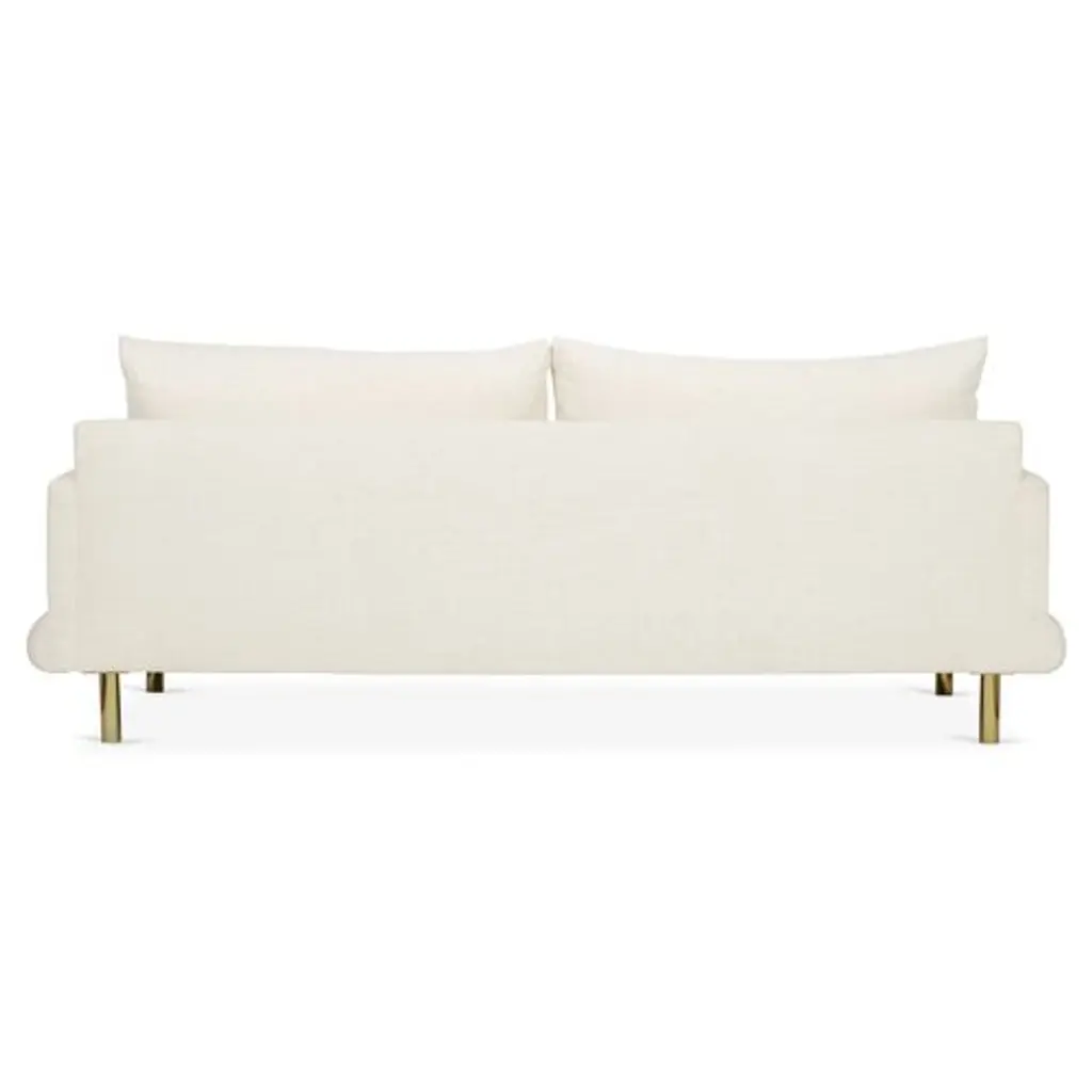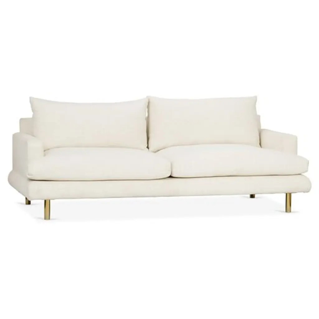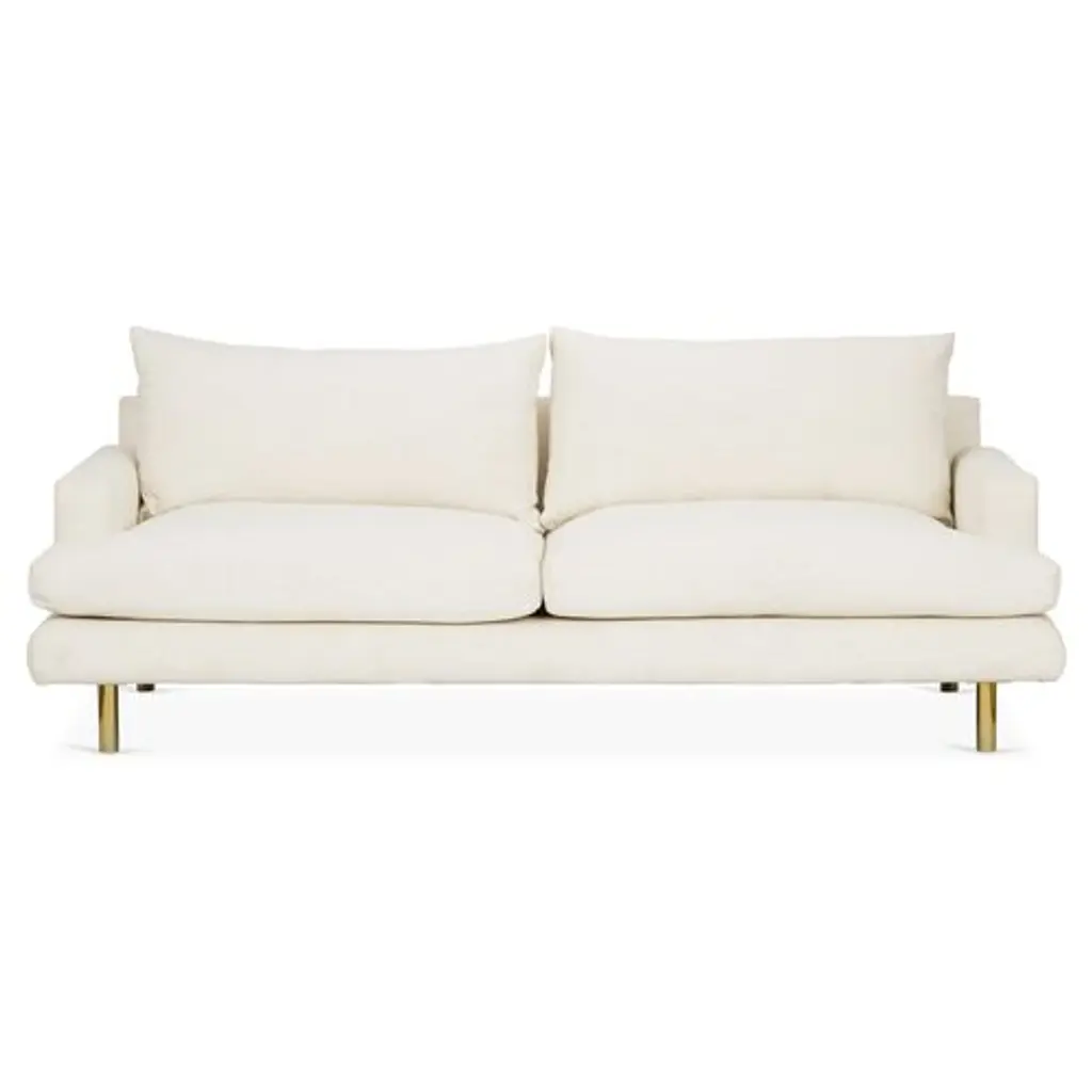 At home in any style of decor, this plush sofa boasts classic track arms, a neutral ivory hue, and slender brass legs for a pop of warmth and shine. And because this piece is upholstered in high-performing Crypton fabric, it repels stains, spills, bacteria, and mold. Handcrafted in Southern California.