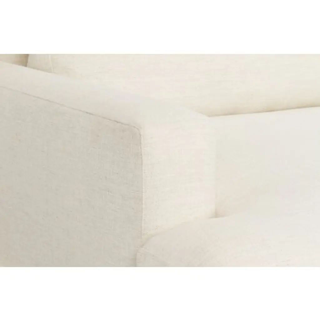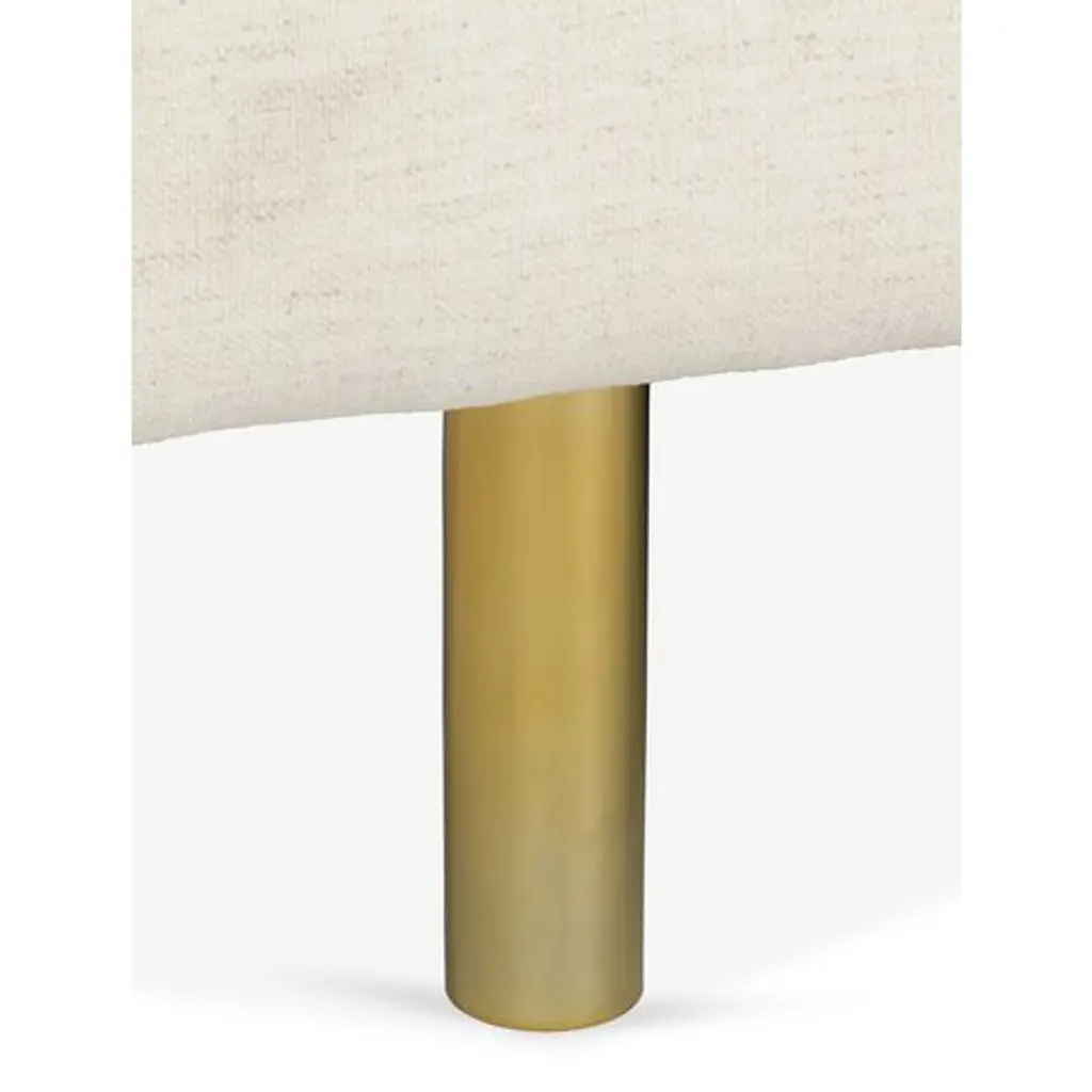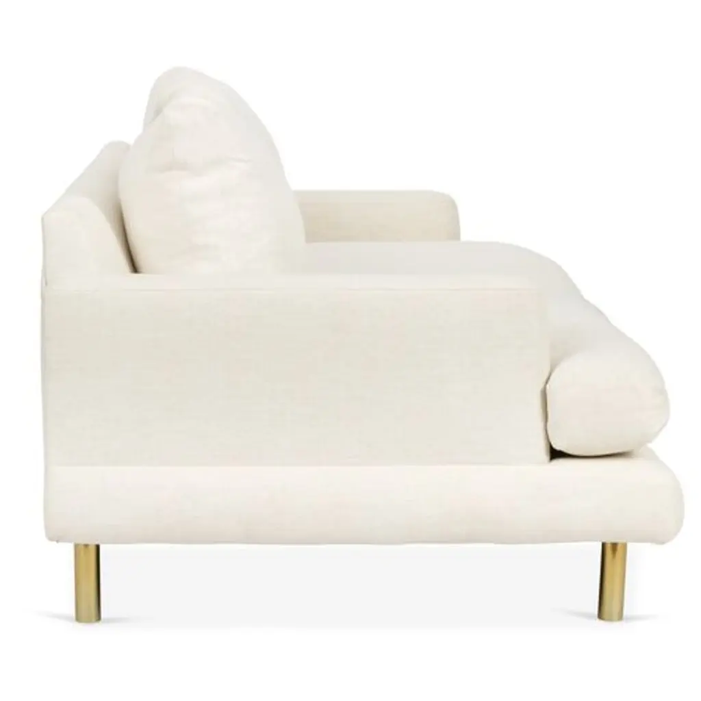 At home in any style of decor, this plush sofa boasts classic track arms, a neutral ivory hue, and slender brass legs for a pop of warmth and shine. And because this piece is upholstered in high-performing Crypton fabric, it repels stains, spills, bacteria, and mold. Handcrafted in Southern California.