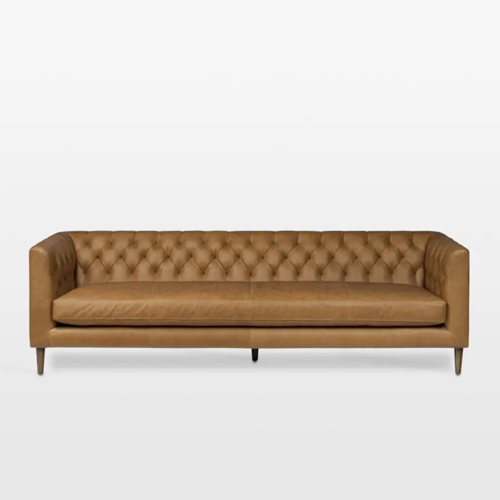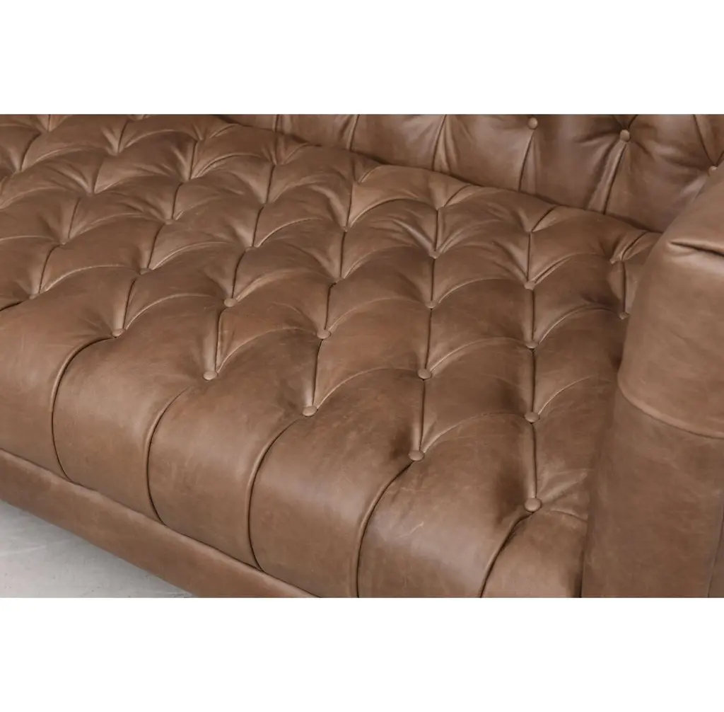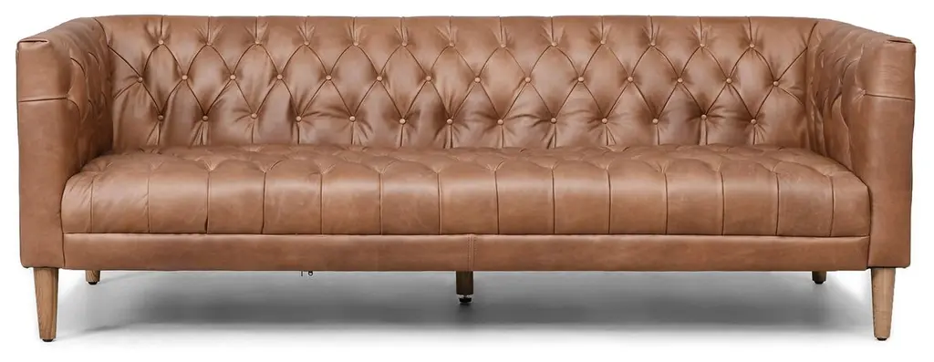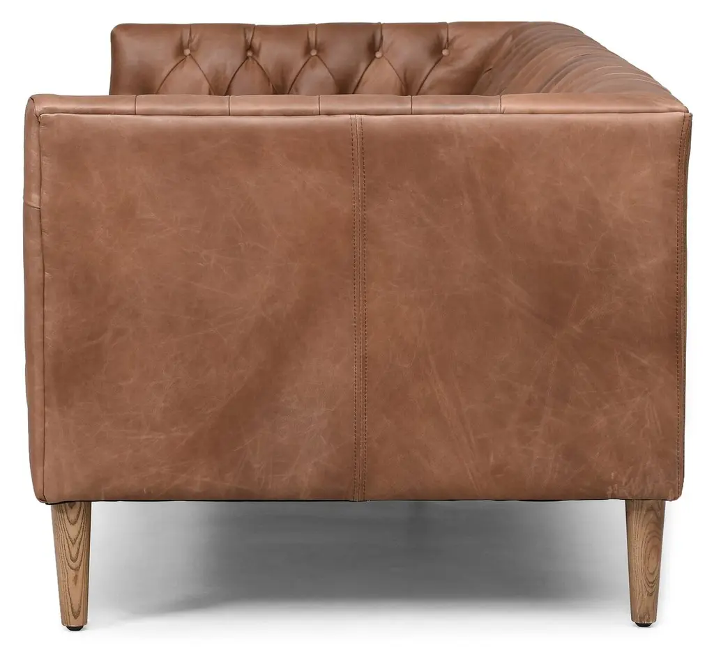 Button-tufted leather upholstery gives this sofa the stateliness of a classic chesterfield, while the tuxedo silhouette and slightly tapered legs provide modern flair. The frame is made of durable, hardy oak.