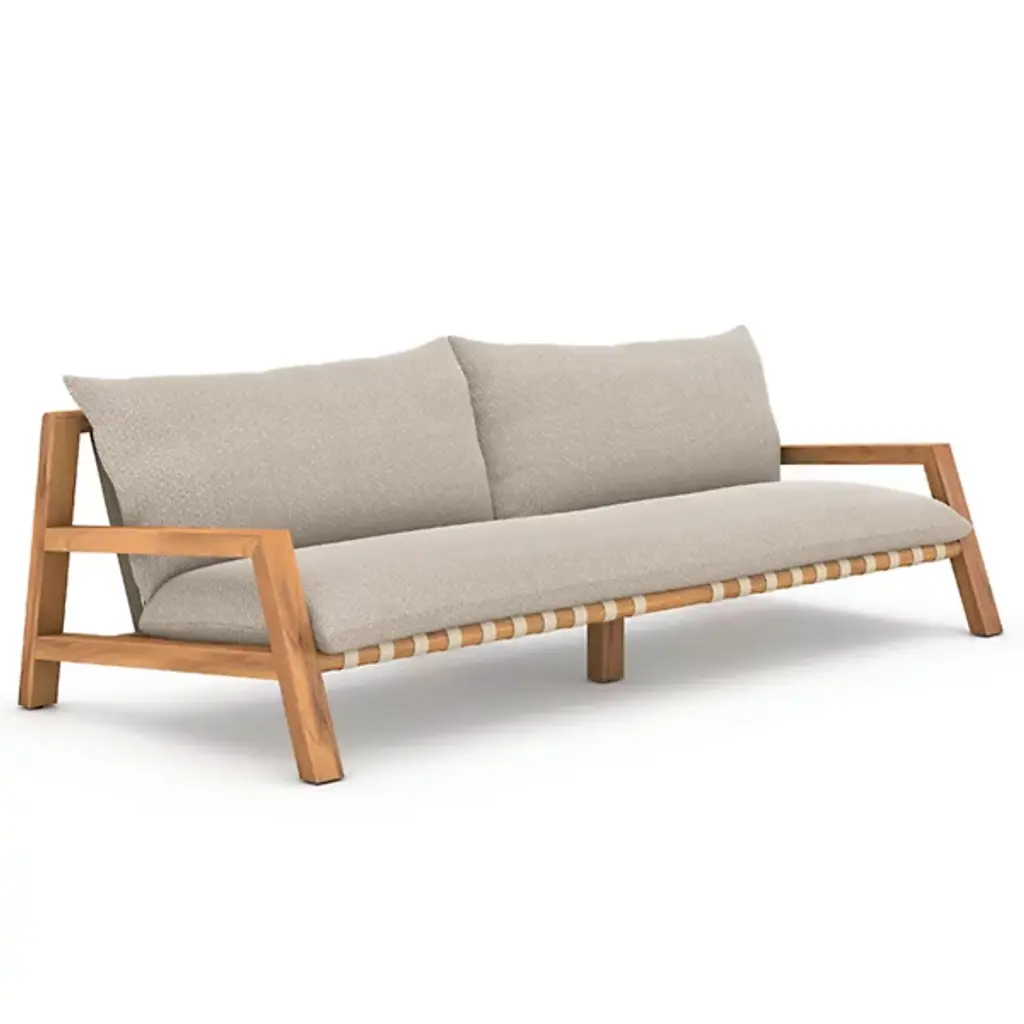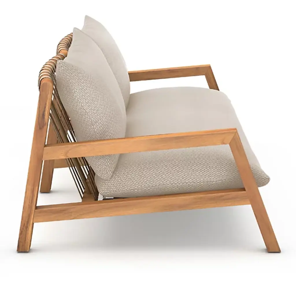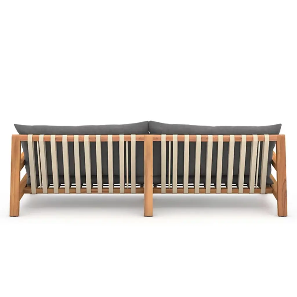 Add inspired comfort and enduring appeal to porches, patios, and more with the encompassing spread of The Soren Outdoor Sofa from Four Hands. An airy assembly of angular sustainably-harvested teak wood accompanied by webbing looped around its seat and back. It expresses a stylish coastal personality, pairing a curved back with plush cushions of Olefin and Polypropylene that add welcome comfort to the robust wooden frame, which can resist inclement weather conditions while generating a unique patina over time.