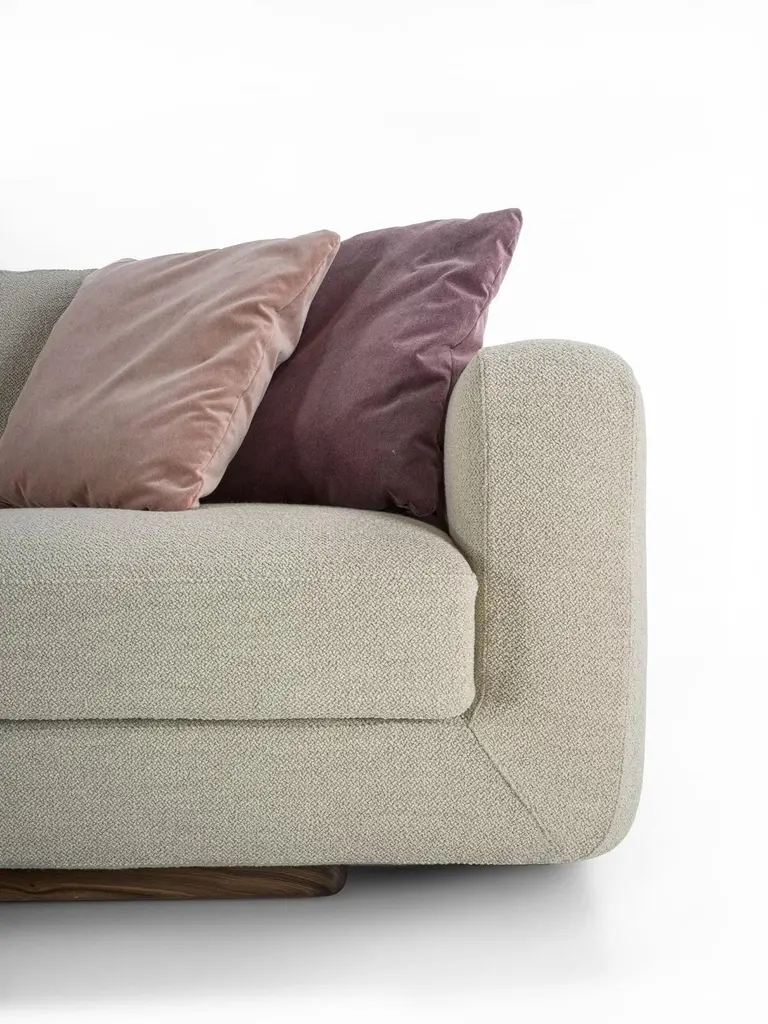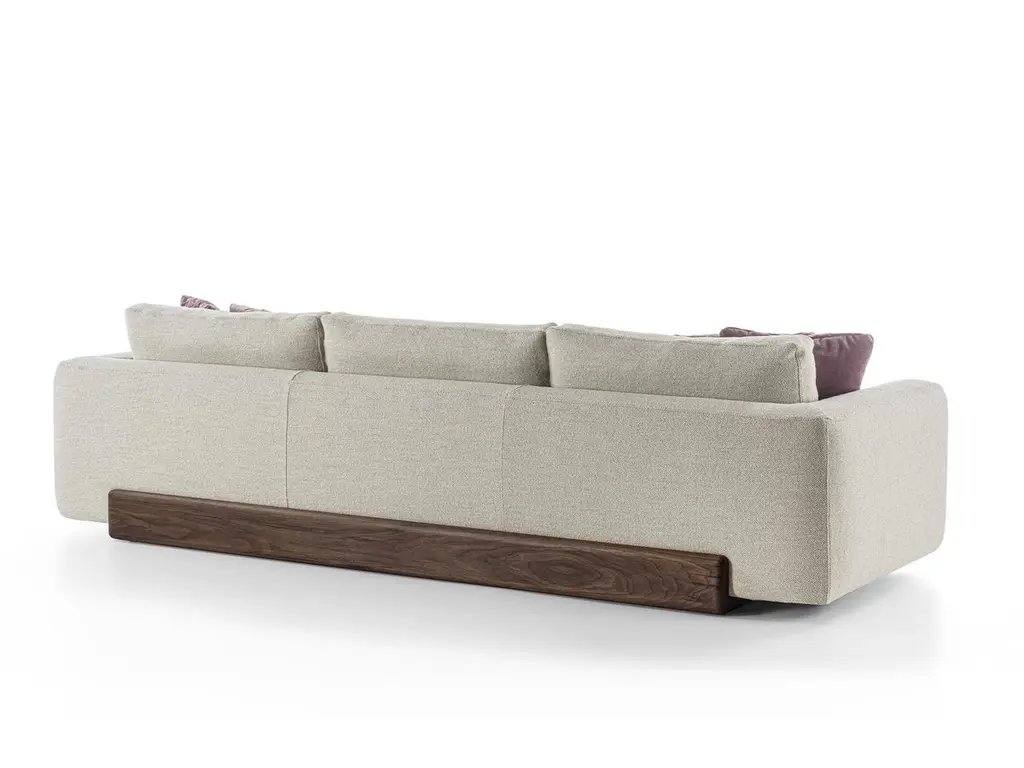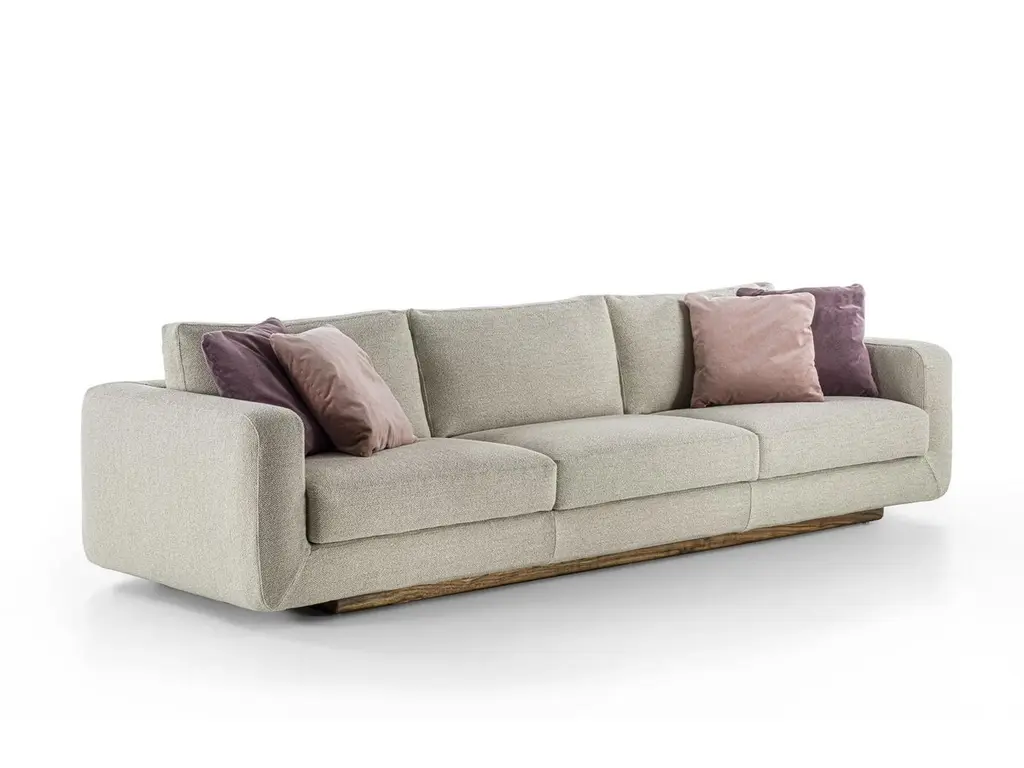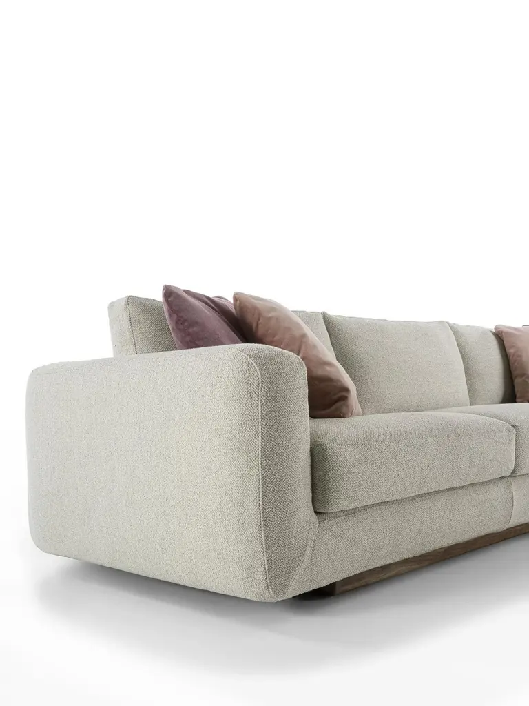 Sofa with a structure born from the union of two compenents characterized by soft, rounded lines: the solid wood base houses soft leather of fabric cushions with visible stitching.