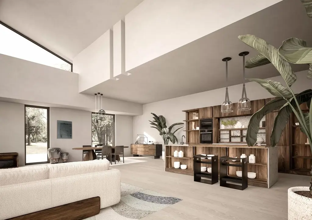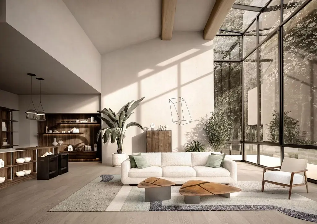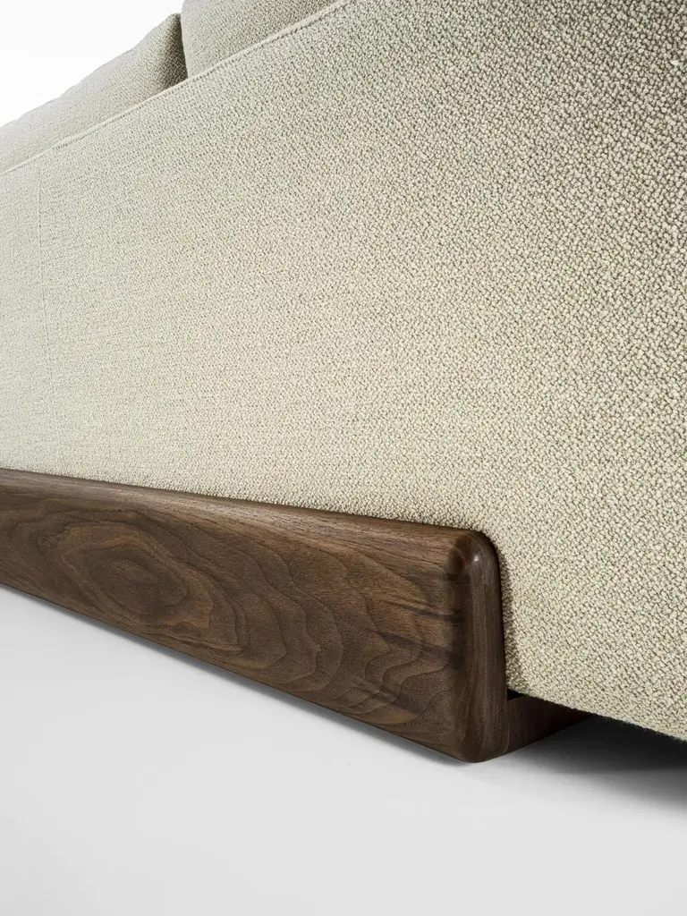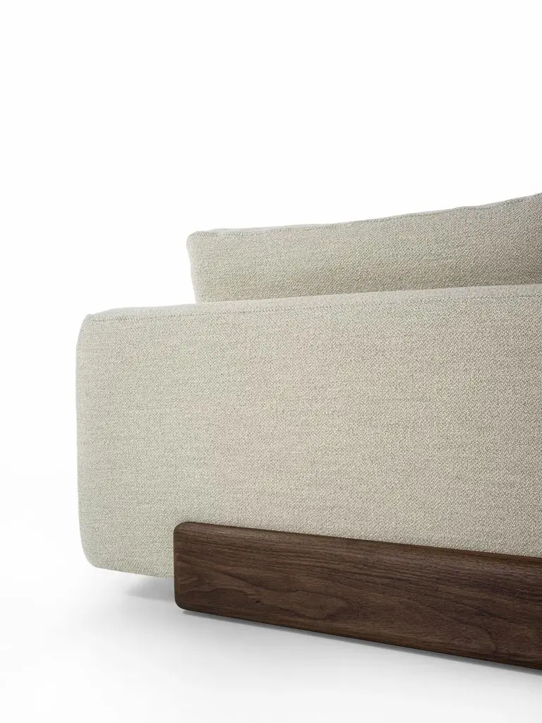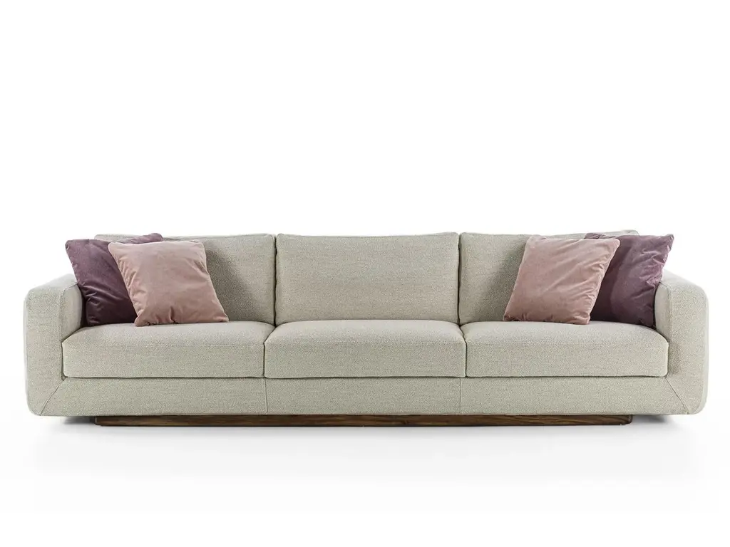 Sofa with a structure born from the union of two compenents characterized by soft, rounded lines: the solid wood base houses soft leather of fabric cushions with visible stitching.