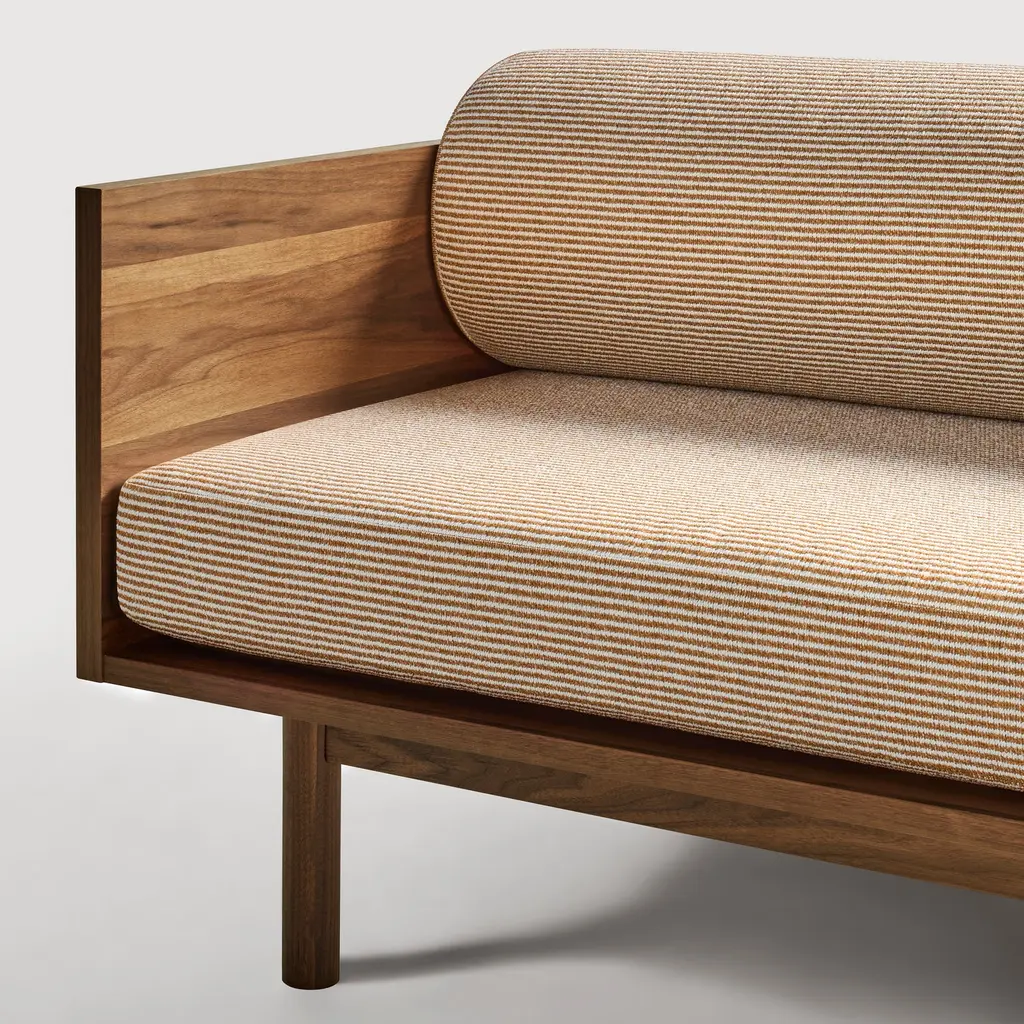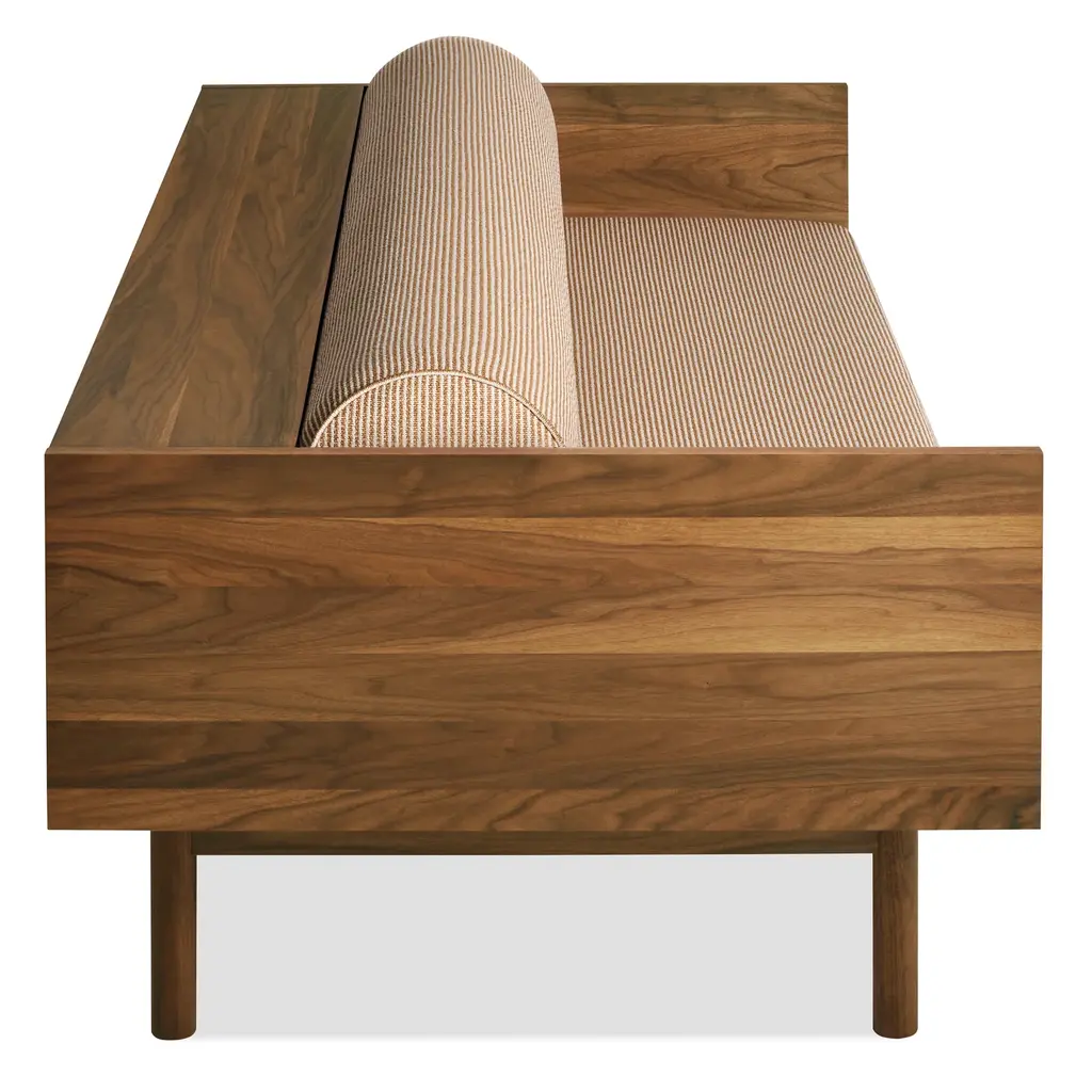 Sofa and bookshelf come together to create an artful display of form and function. Solid wood makes for a dazzling surround while serving as a chic spot to show off your ephemera or rest your martini. A genteel bolster provides ample support and a pleasing vintage vibe without the online auction.