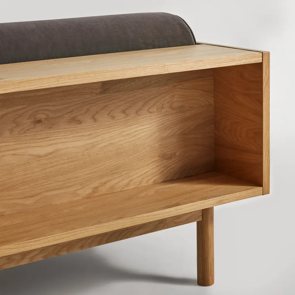 Sofa and bookshelf come together to create an artful display of form and function. Solid wood makes for a dazzling surround while serving as a chic spot to show off your ephemera or rest your martini. A genteel bolster provides ample support and a pleasing vintage vibe without the online auction.