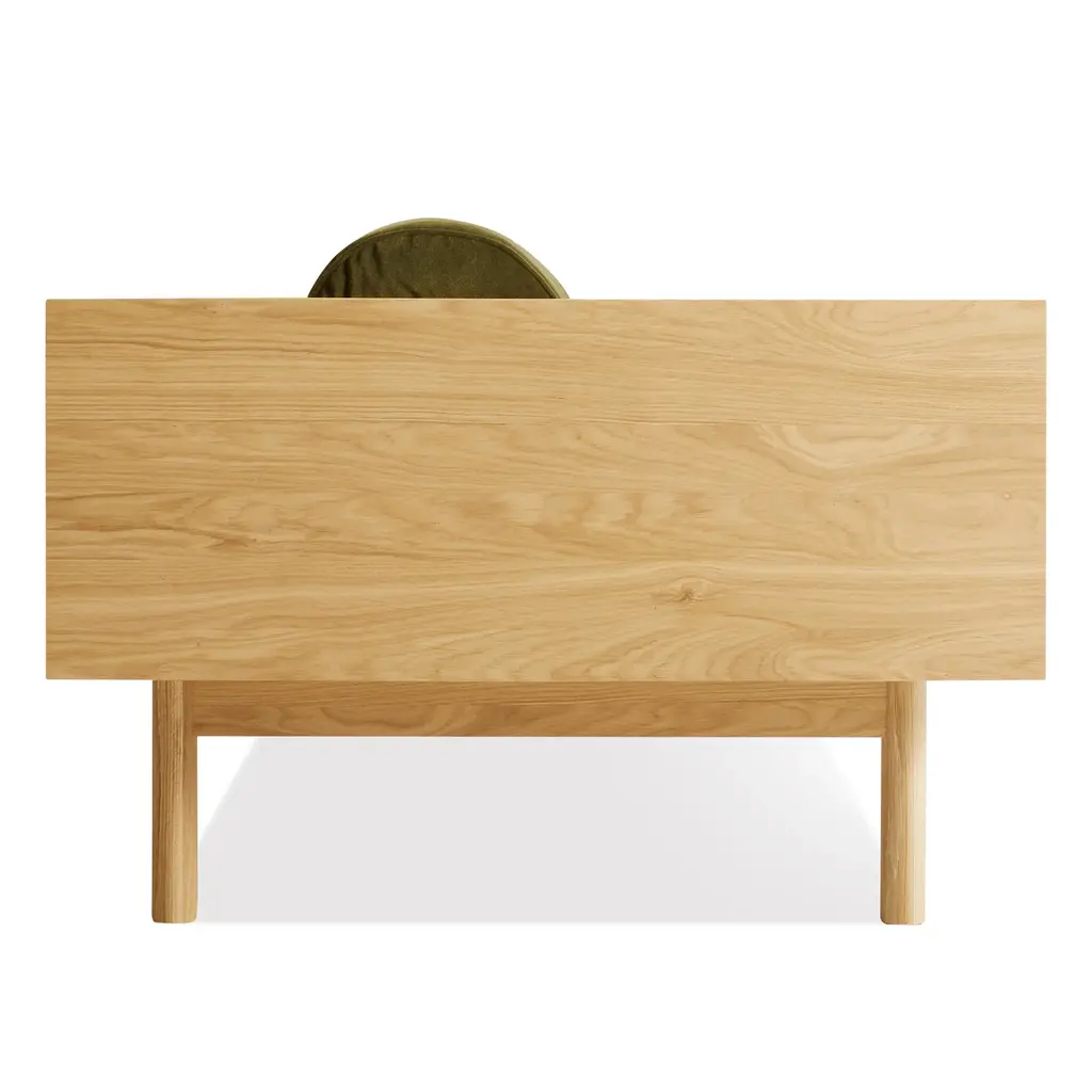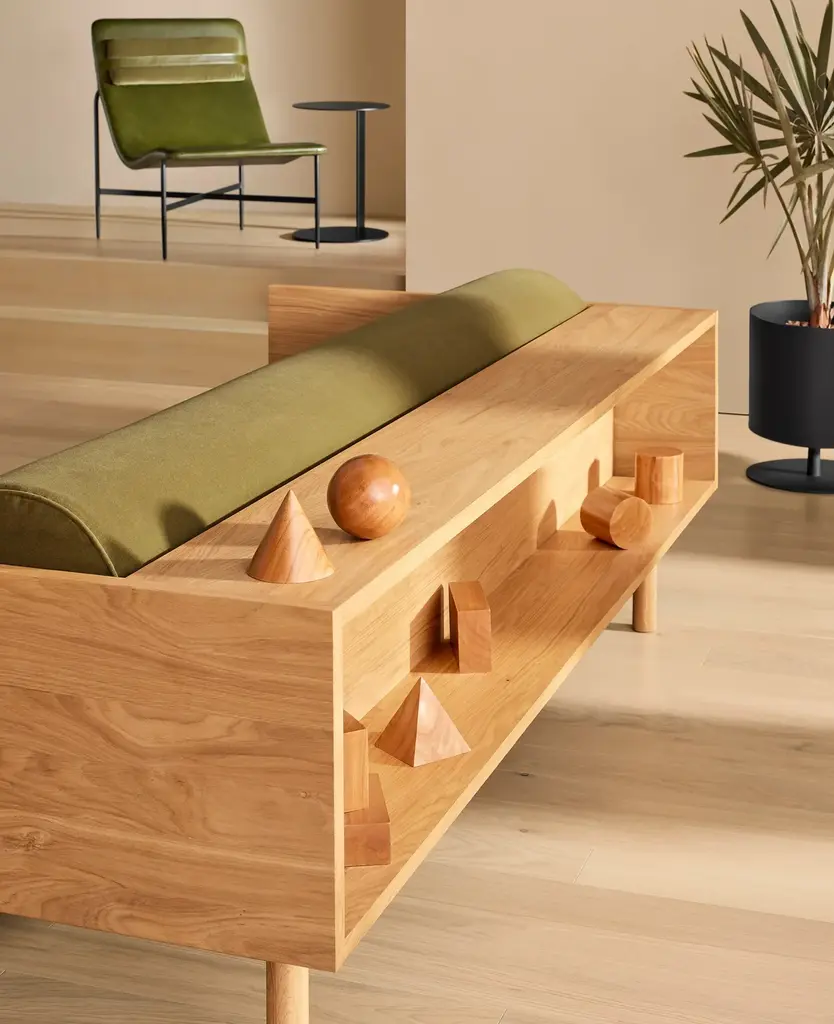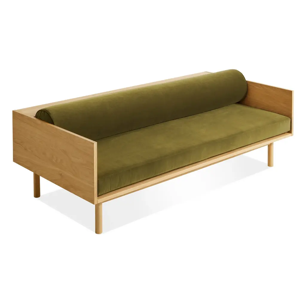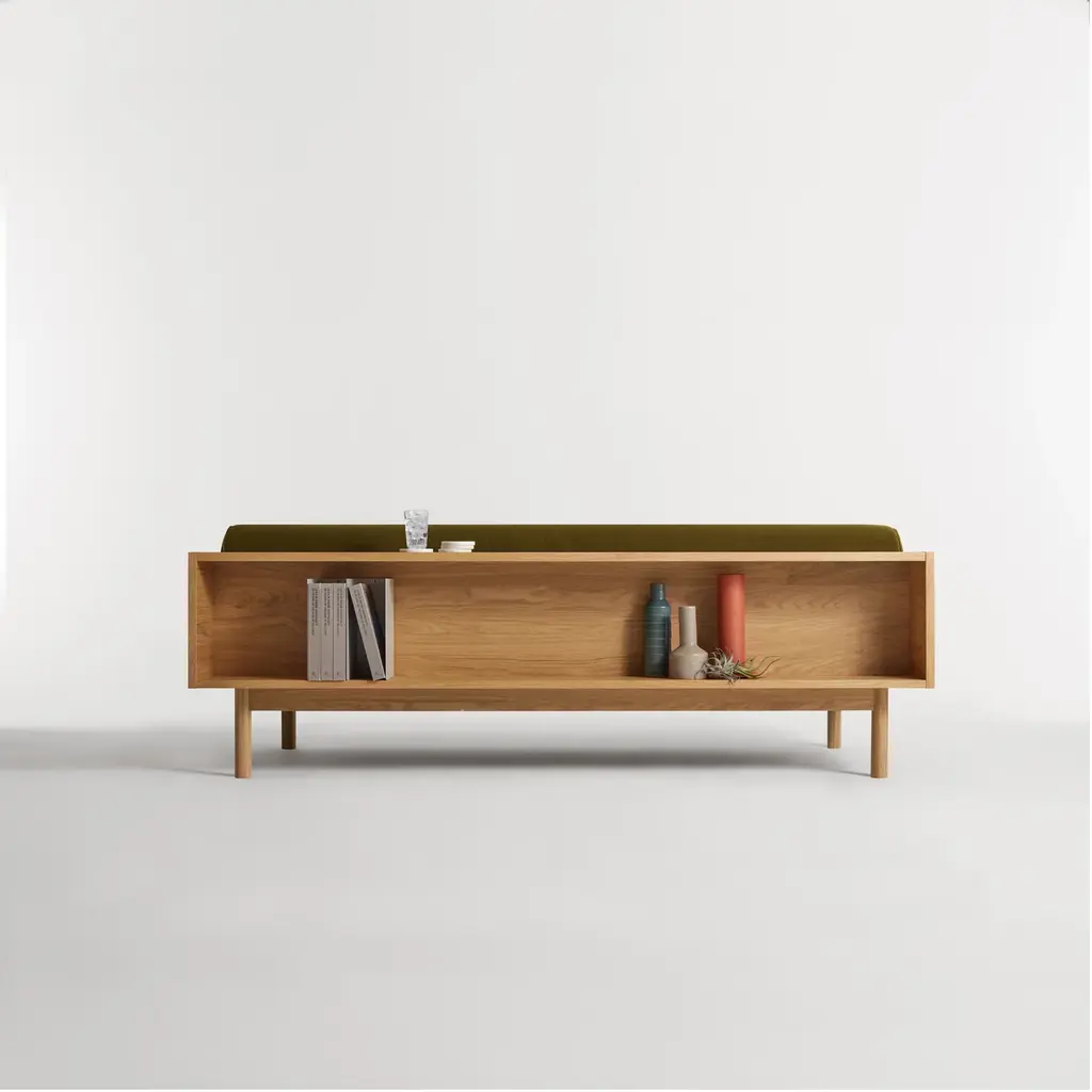 Sofa and bookshelf come together to create an artful display of form and function. Solid wood makes for a dazzling surround while serving as a chic spot to show off your ephemera or rest your martini. A genteel bolster provides ample support and a pleasing vintage vibe without the online auction.