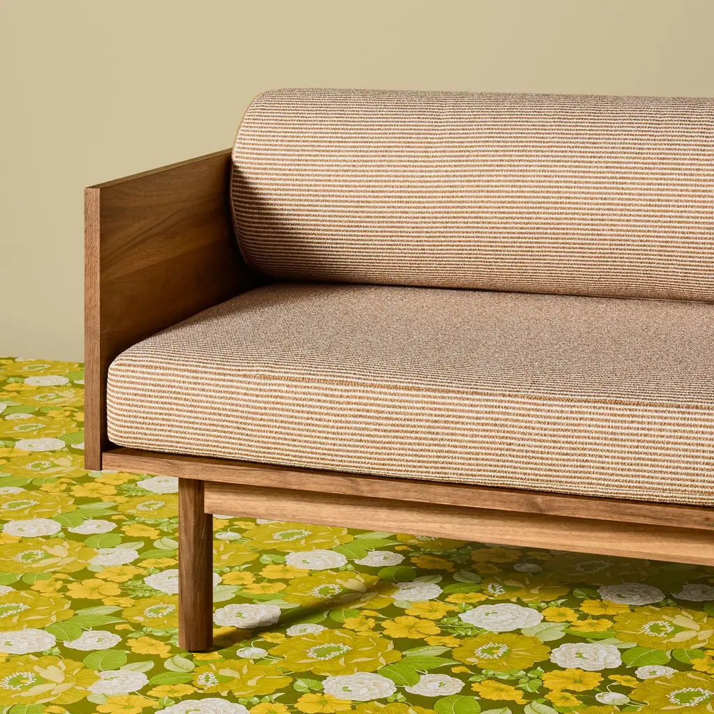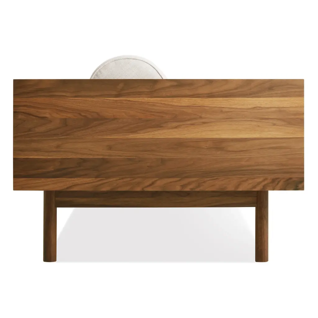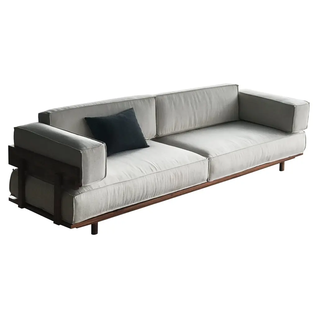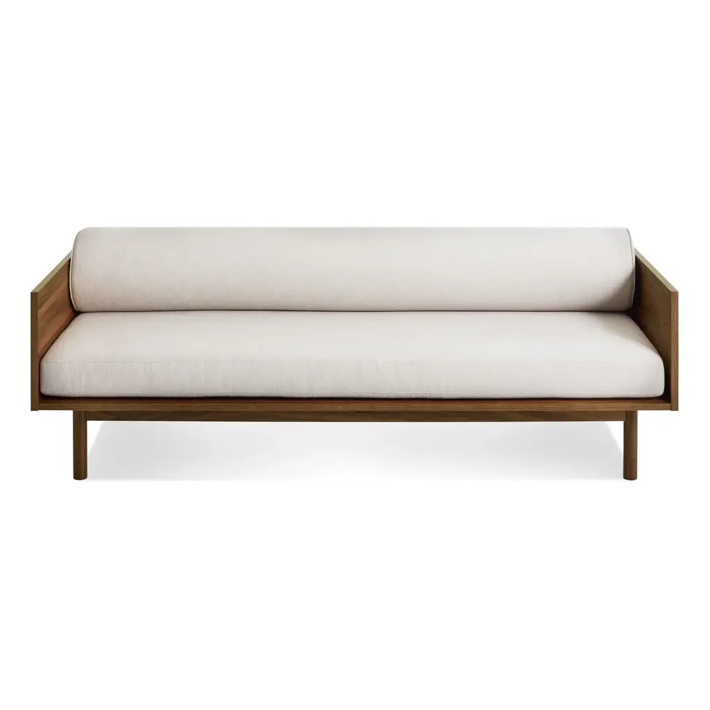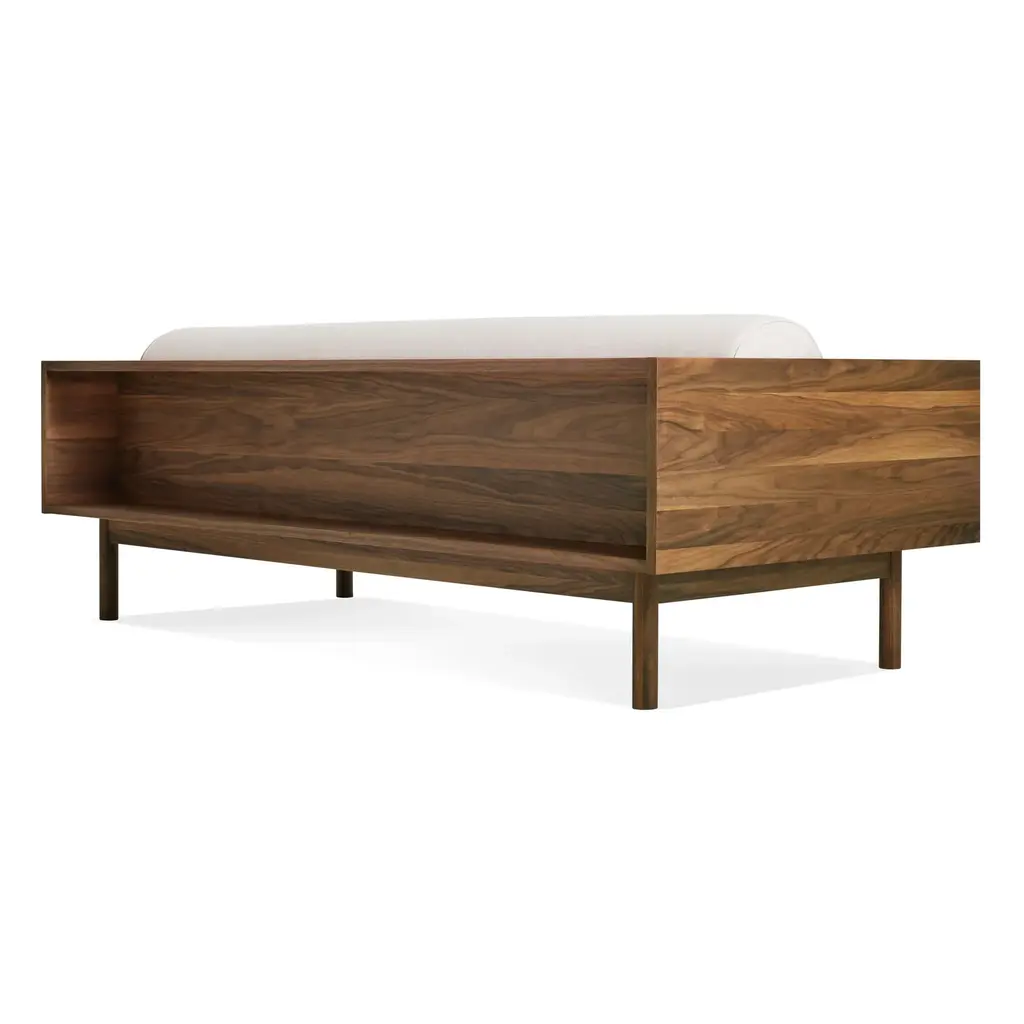 Sofa and bookshelf come together to create an artful display of form and function. Solid wood makes for a dazzling surround while serving as a chic spot to show off your ephemera or rest your martini. A genteel bolster provides ample support and a pleasing vintage vibe without the online auction.