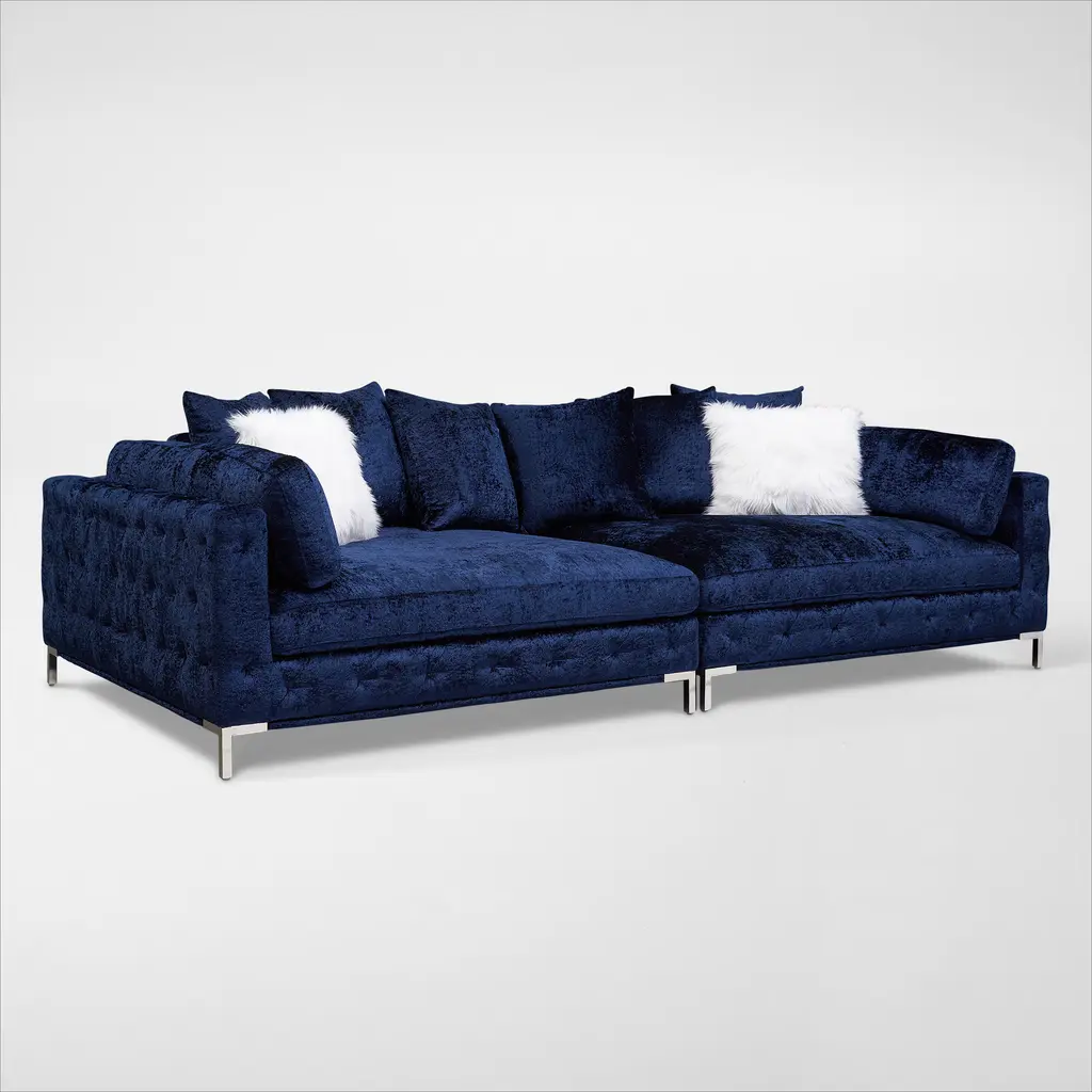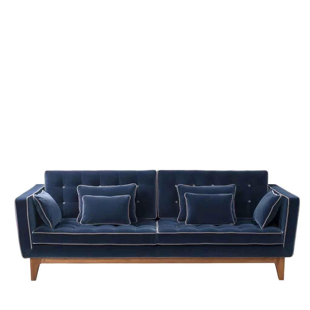 Marked by a vibrant cobalt blue Dacron upholstery and a classic silhouette, this sofa exudes comfort and style. The tapered armrests form a well-balanced unit with the platform base, while the multi-density polyurethane padding of seat and back cushions enhances the plush silhouette. This elegant sofa is raised on solid wood feet with a black finished. Please ask the Concierge for other available finishes.