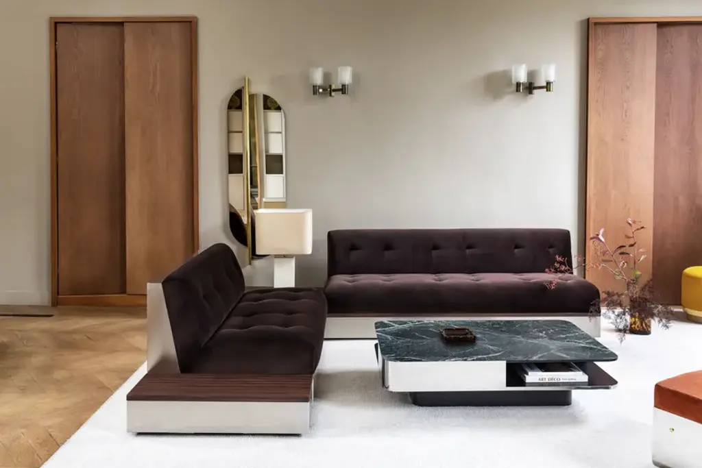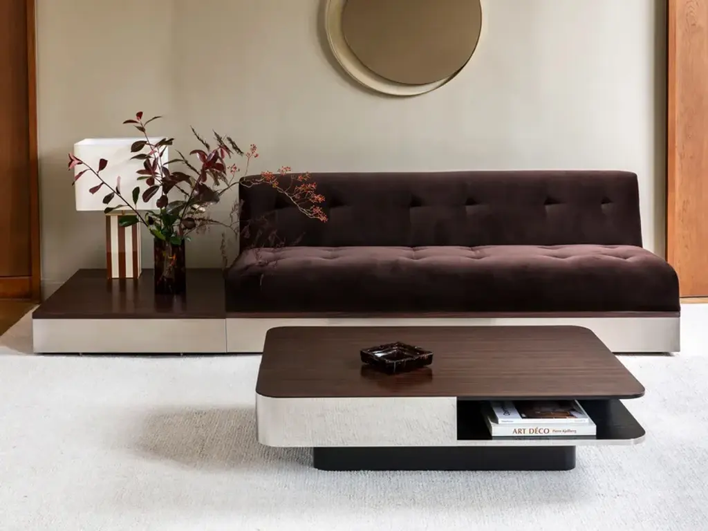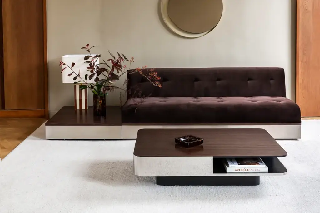 Stanley is a modular sofa composed of 2 units in fabric and stainless steel. Structure in rosewood. Expanded polyurethane foam.Well-built design accented by stainless steel and rosewood to be modulated according to the client's desires. With its retro Sci-Fi lines and generous volumes, the new Stanley collection is an ultra-comfortable trip back to the 1970s. The Stanley sofa and armchair are endlessly adaptable and are experienced in "lounge mode".