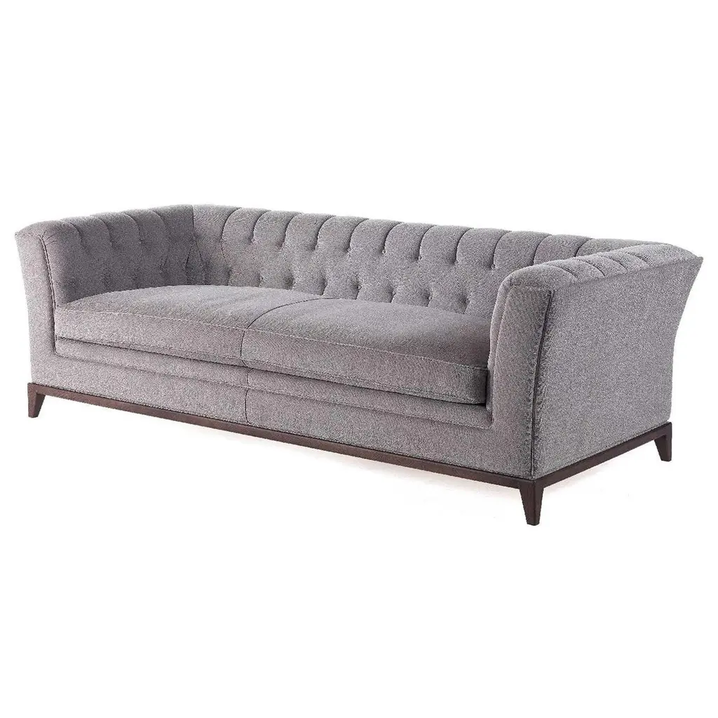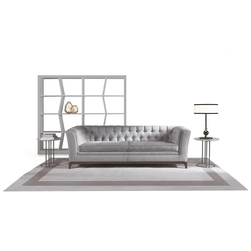 The tailored look of the Stark Sofa will add elegance in a modern living room or study offering sheltering comfort. Upholstered in light-gray fabric, the squared-off frame is detailed with a soft continuous button-tufted back and angled arms. The tapered legs and base are in Canaletto walnut wood for a harmonious fusion of classic and contemporary. Available also in a 2-seater size, armchair or ottoman. For customization options, please contact Concierge.
