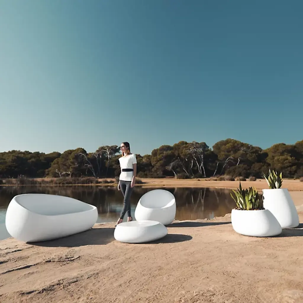 Designed by Stefano Giovannoni, 2010. Made in Spain by Vondom. Embodying the epitome of harmony between nature, man and space, the Stone Sofa channels Zen-like tranquility to artificial landscapes with its unmistakable silhouette. Its gracefully carved out seat section offers a natural feeling cradle and ample comfort to the user. Durable and weatherproof, this modern sofa's polyethylene composition allows you to also place it outside in the harsh elements. And because it's not as heavy as it looks, this three-seater sofa can be moved around with little effort. Create a relaxing oasis indoors or out with the Stone Sofa. Available in several vibrant colors and two finishes.