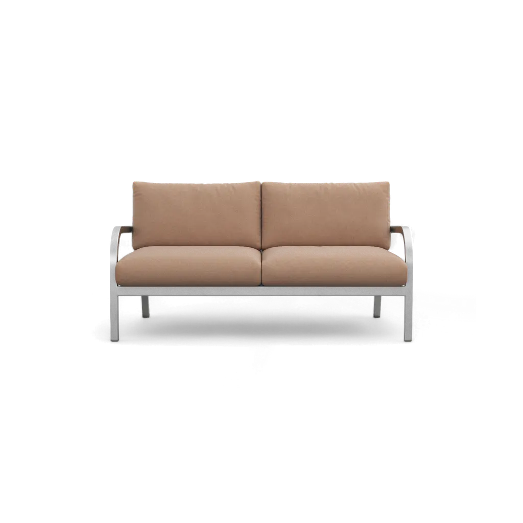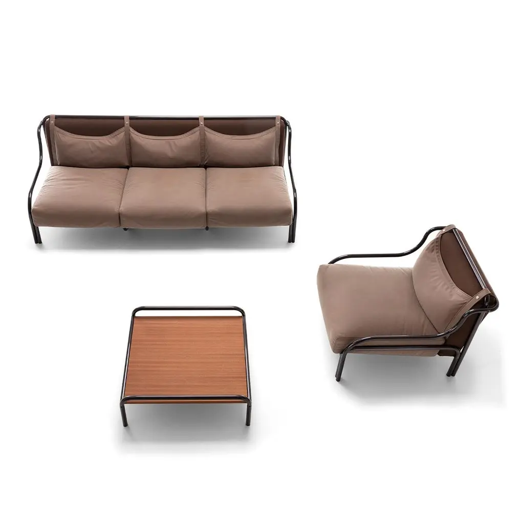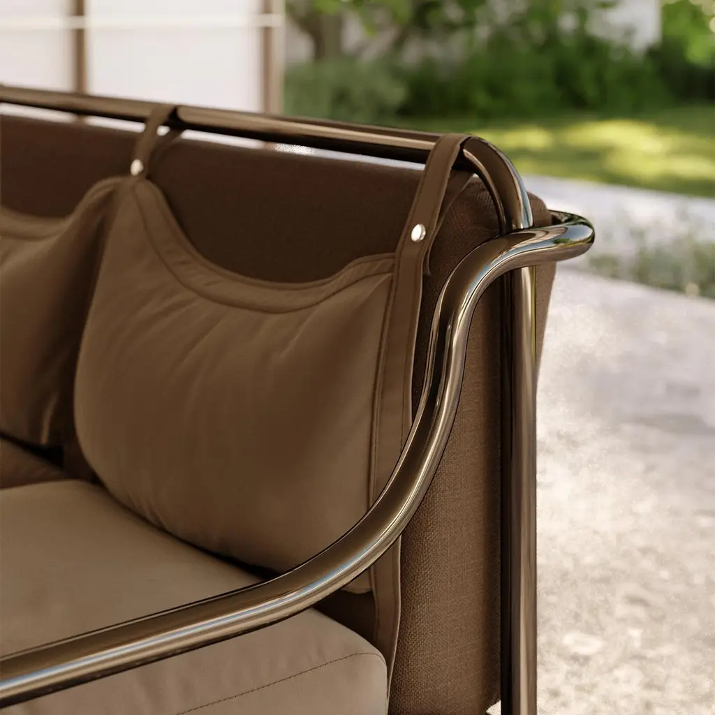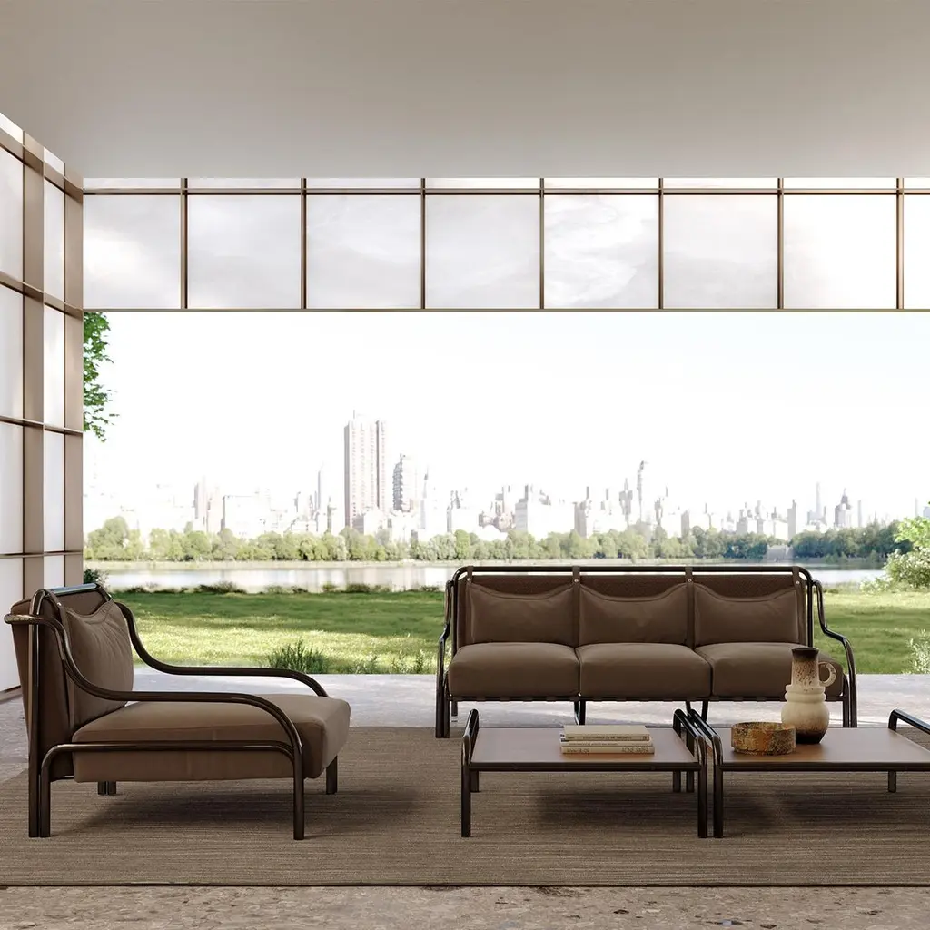 Designed to seduce with its plump volumes sealed by a combination of brown fabric and prized nautical Nubuck gray leather, this three-seater sofa is an original 1963 design by Gae Aulenti sure to ideally complement refined porches or terraces of vintage inspiration. The gunmetal-gray-finished stainless steel structure maximizes the weatherability already provided by the rest of its waterproof elements, for a safe and light-hearted outdoor use. If the products are placed completely outside, nightcovers that can be purchased at an extra price are recommended. Please contact the Concierge for further information.