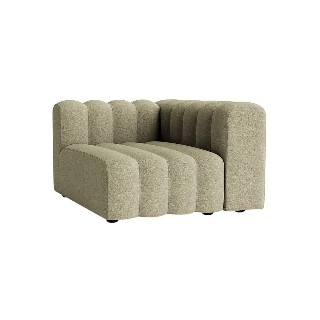 Inspired by the bold aesthetics of the 1970s, the Studio Modular Sofa from Nor11 is characterized by its fluted upholstery and soft, inviting lines. The system includes multiple module variations that can be arranged to form different setups, whether for small living areas or larger social spaces. The loose armrest cushions are movable yet dense, boasting ample customization without sacrificing a comfortable and sturdy seat. Modules can be linked using a click-link system and are available in a wide range of high-quality fabrics and leather options.