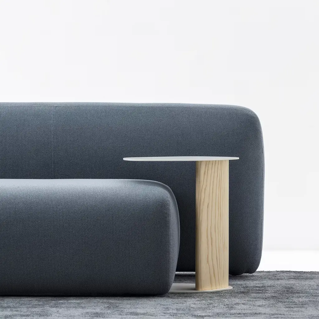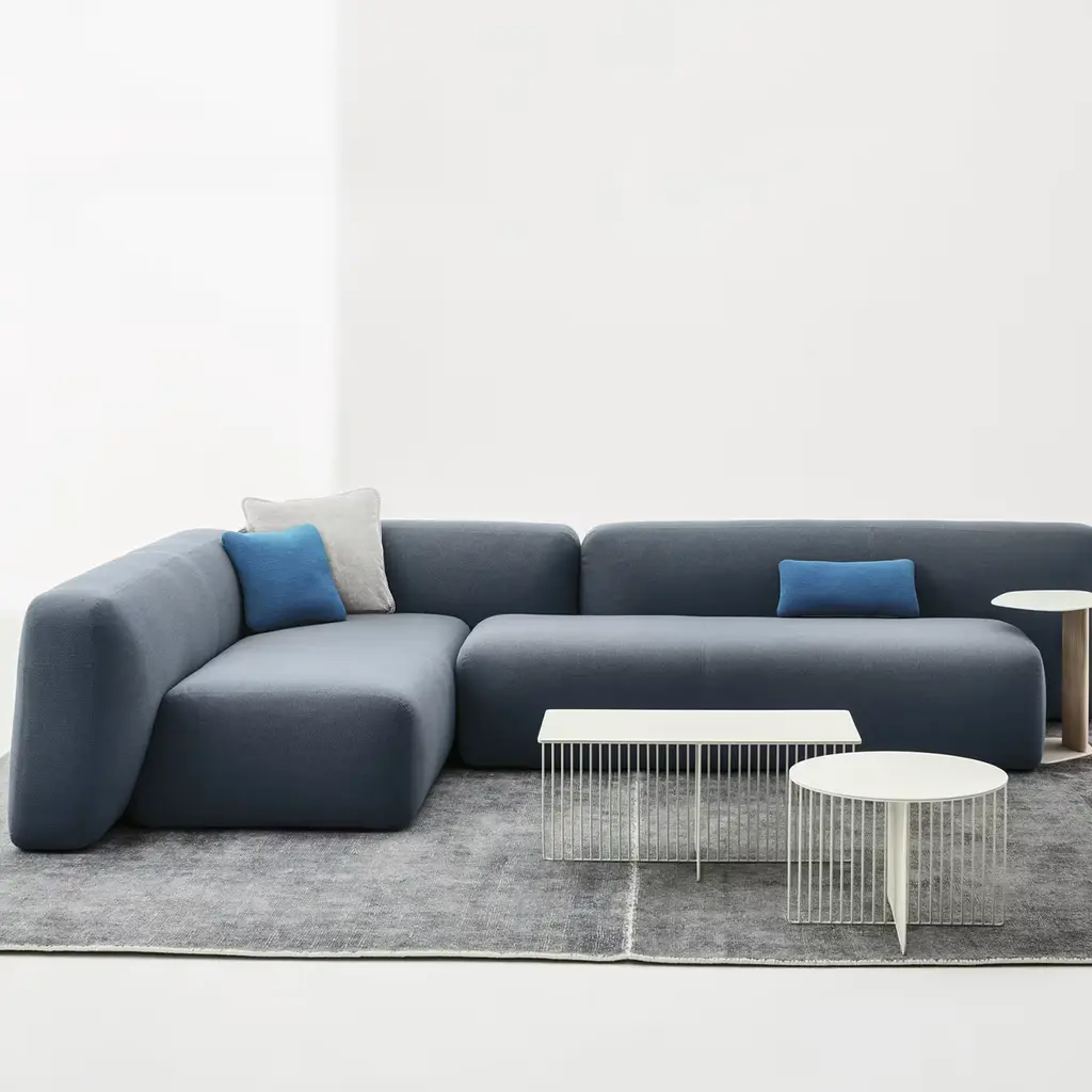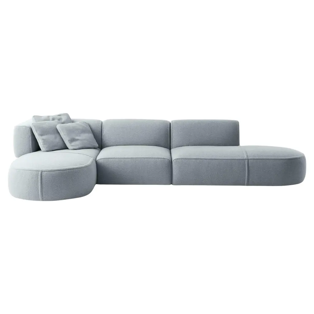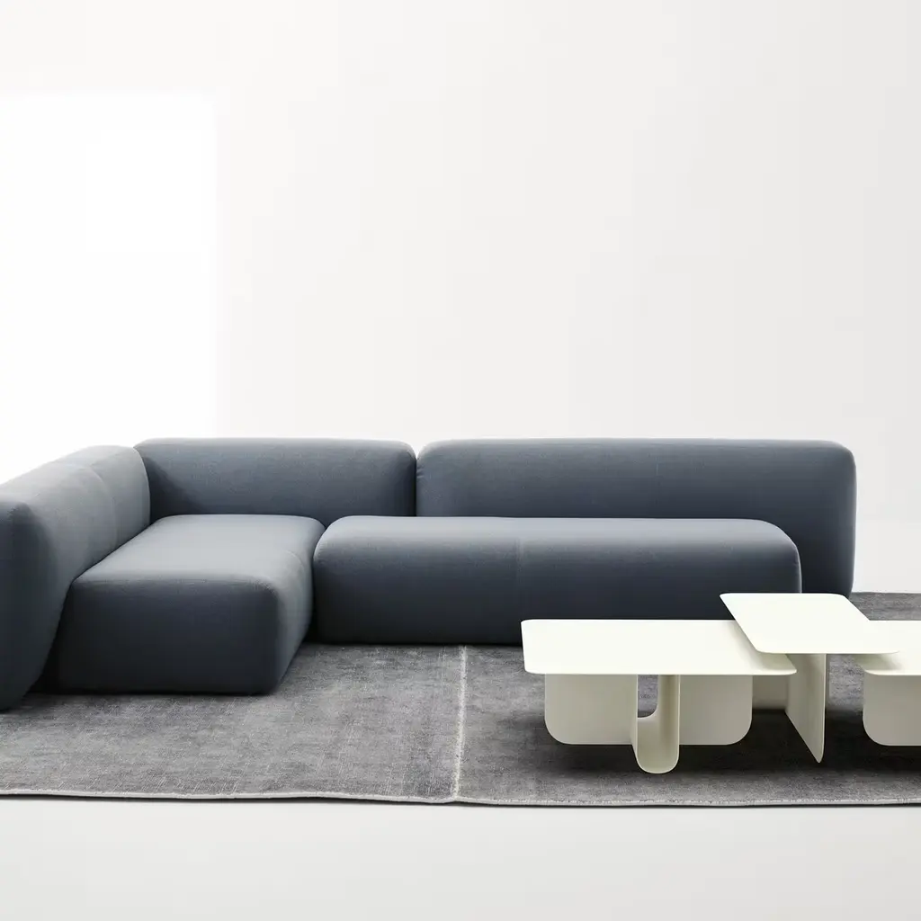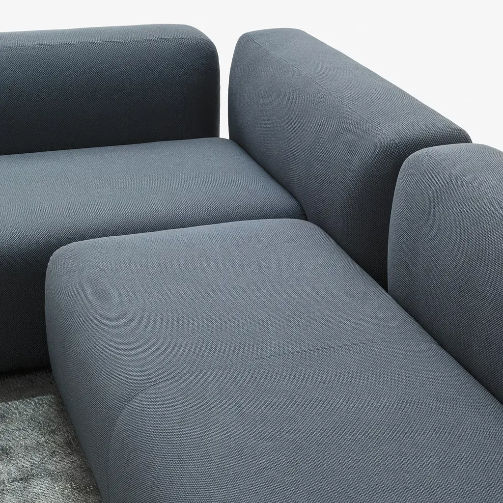 This plush sofa is part of a collection of padded seats inspired by the Japanese art of arranging stones that gives it its name. The modules boast essential volumes of organic inspiration that are arranged in harmonious staggered compositions. Sculptural and smooth, this piece features a structure in solid ash, solid fir, and a masonite panel. The padding is in fire-resistant and non-deformable polyurethane of different densities with polyester fiber. The petrol-blue fabric upholstery is removable upon request.