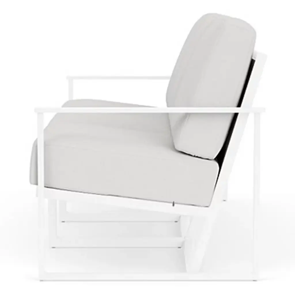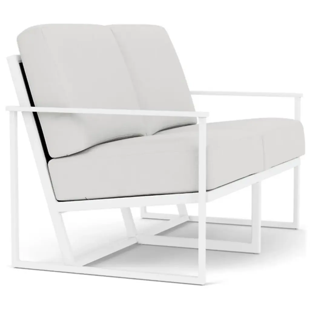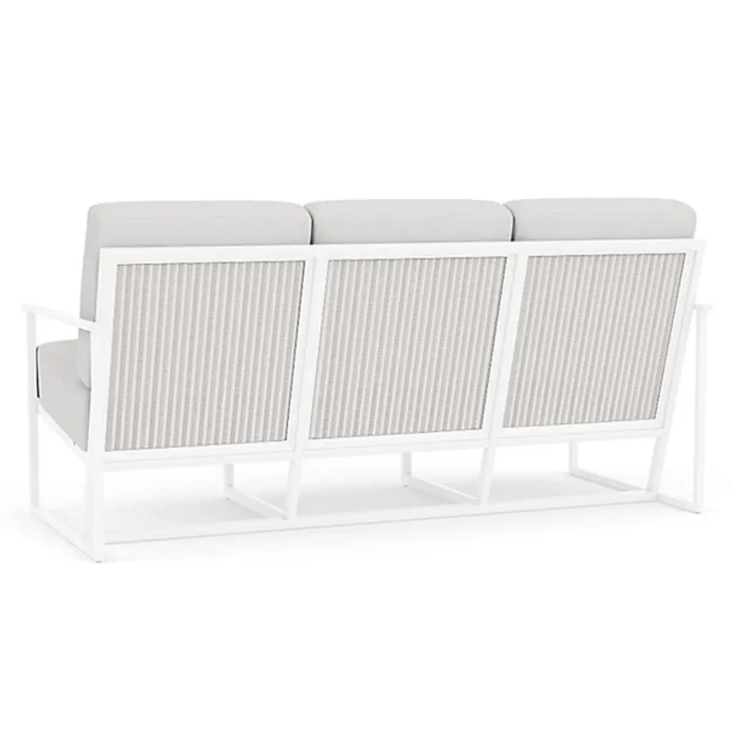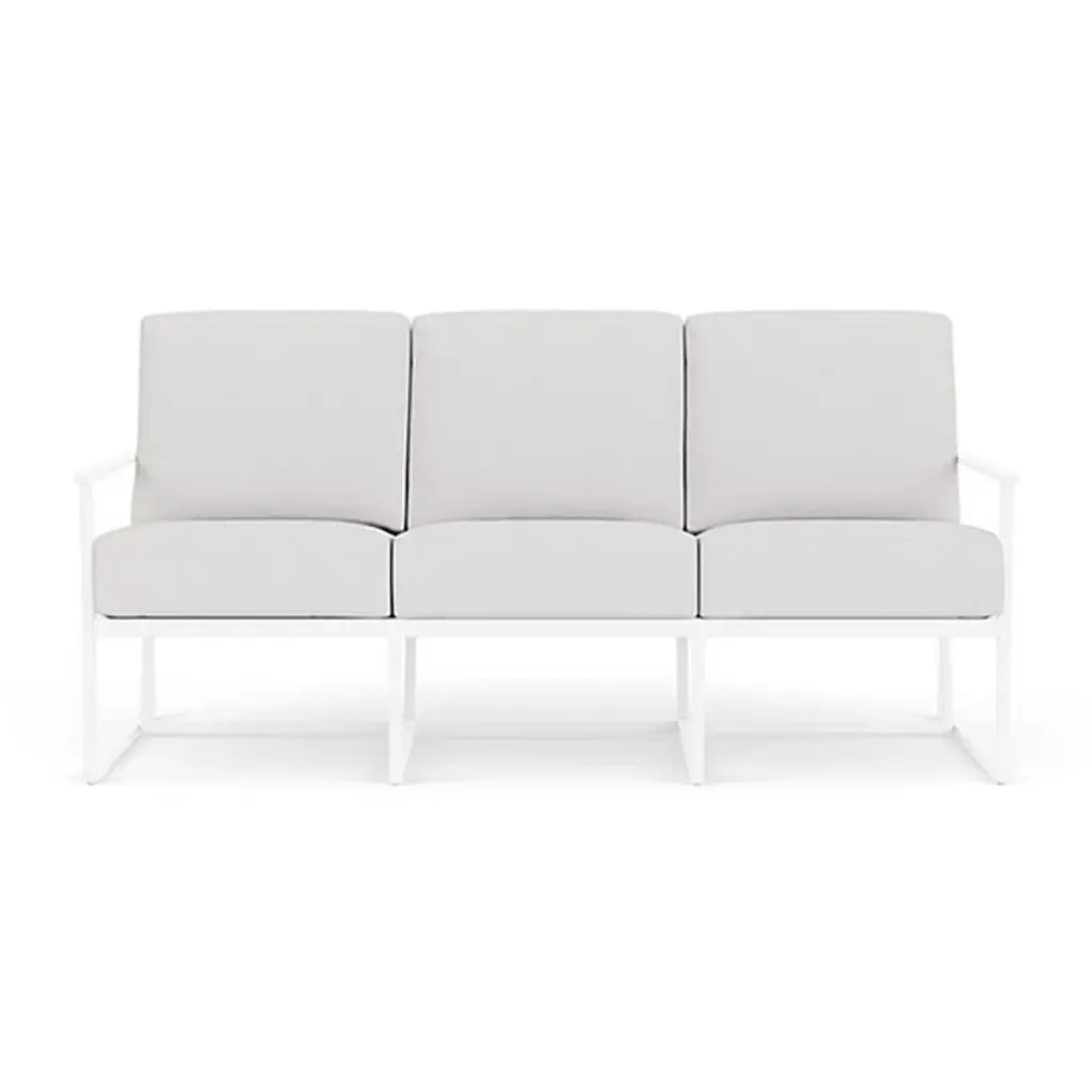 The Summit Outdoor Sofa from Lloyd Flanders combines straightforward design elements with lasting comfort for the ultimate in outdoor living. Made in the USA, it combines a robust, rust-resistant aluminum frame with rustic panels of textured Lloyd Loom Wicker made of wire-reinforced cellulose surfaced in a lasting resin that fills the seat and back. Slim armrests and angled seating create a relaxing presence, while vertical braces add strong central support. Cushions wrapped in weatherproof Sunbrella fabric provide long-lasting comfort, ideal for solo lounging or entertaining larger group gatherings as a practical and inviting addition to outside living areas.