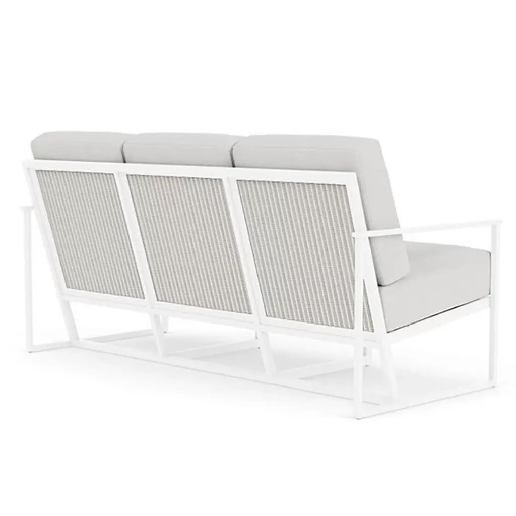 The Summit Outdoor Sofa from Lloyd Flanders combines straightforward design elements with lasting comfort for the ultimate in outdoor living. Made in the USA, it combines a robust, rust-resistant aluminum frame with rustic panels of textured Lloyd Loom Wicker made of wire-reinforced cellulose surfaced in a lasting resin that fills the seat and back. Slim armrests and angled seating create a relaxing presence, while vertical braces add strong central support. Cushions wrapped in weatherproof Sunbrella fabric provide long-lasting comfort, ideal for solo lounging or entertaining larger group gatherings as a practical and inviting addition to outside living areas.
