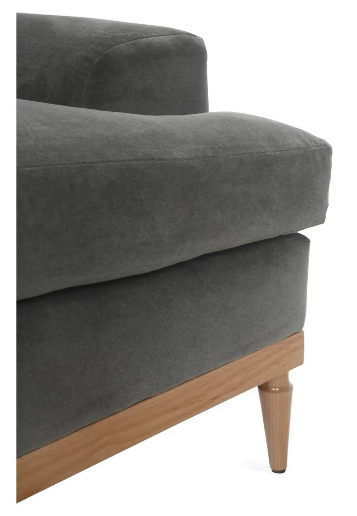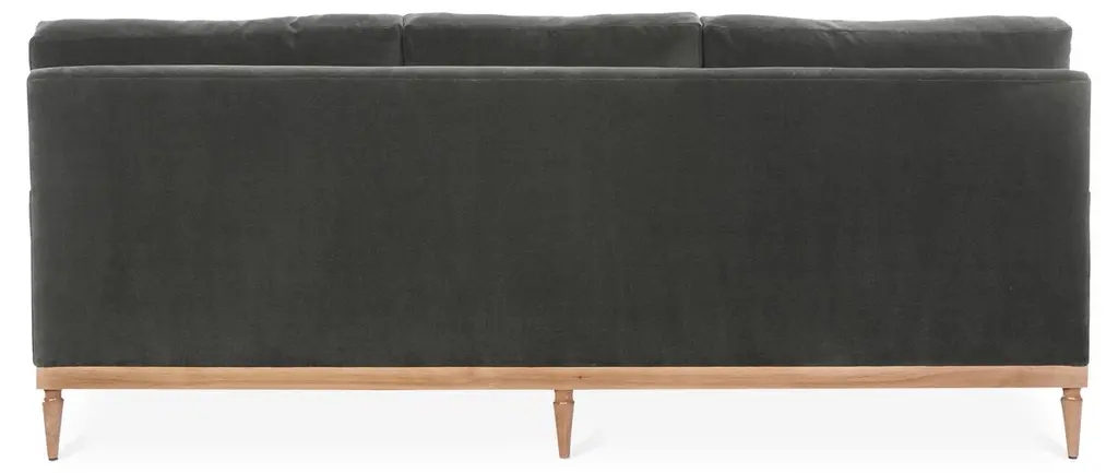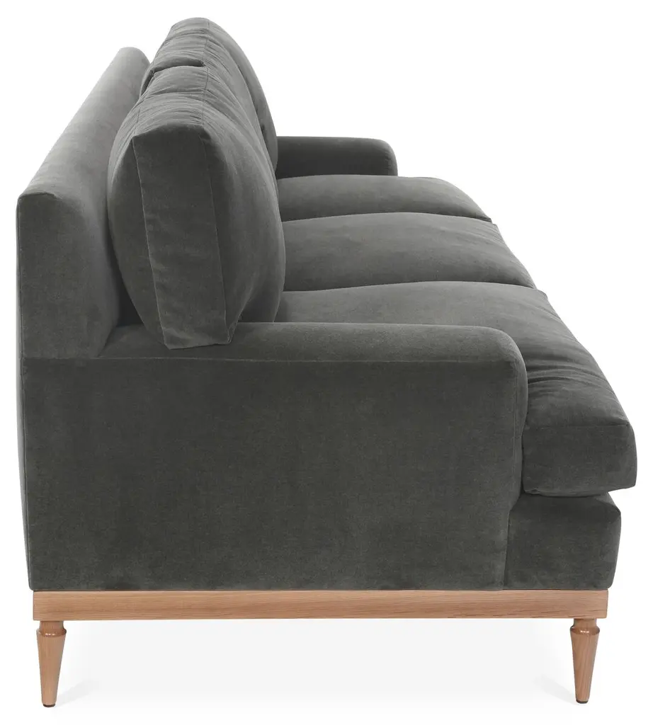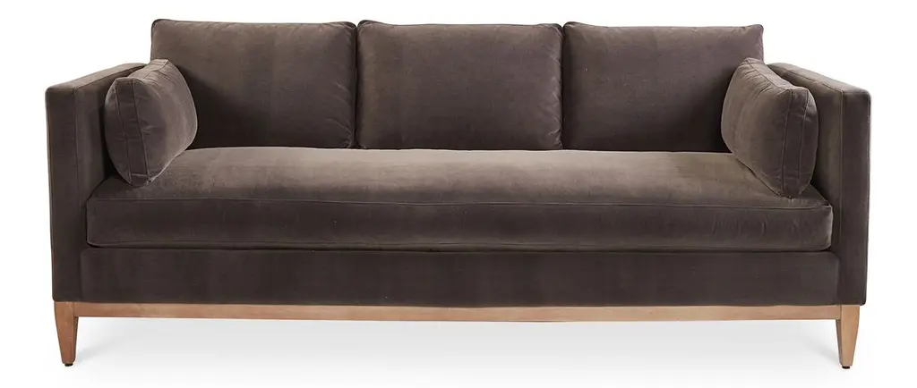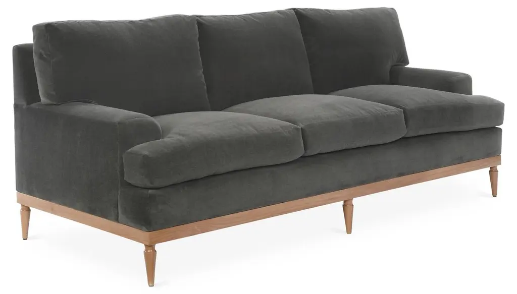 Designed by us and available only at One Kings Lane: Exuding modern elegance, this sofa is framed in alder with an exposed base and tapered legs. Its luxurious velvet upholstery makes it stand out in any room, while its plush feather-and-down fill ensures long-lasting comfort.