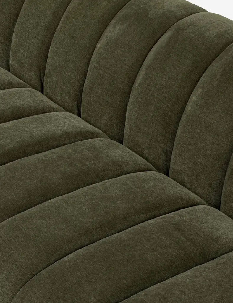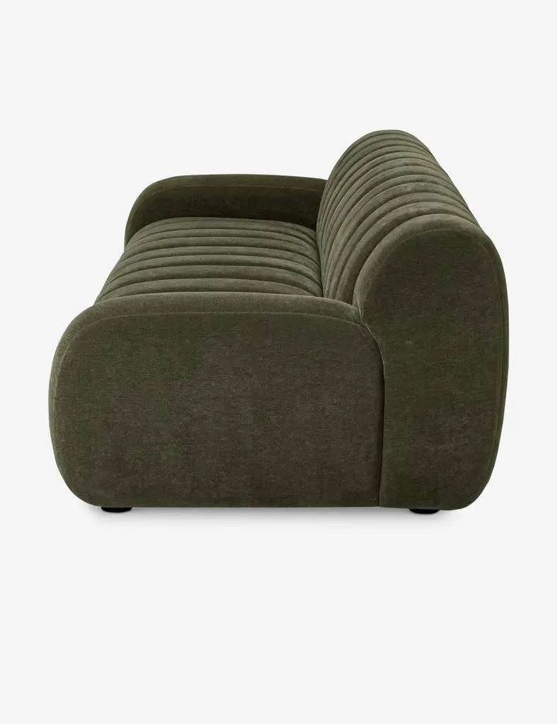 The Suzanne sofa delivers bold comfort with oversized channeling and a sculptural silhouette. Upholstered in a performance fabric with a soft, textured hand, its plush bench seat and curved form invite relaxed lounging. This statement sofa brings a cozy-meets-modern look to any living space.