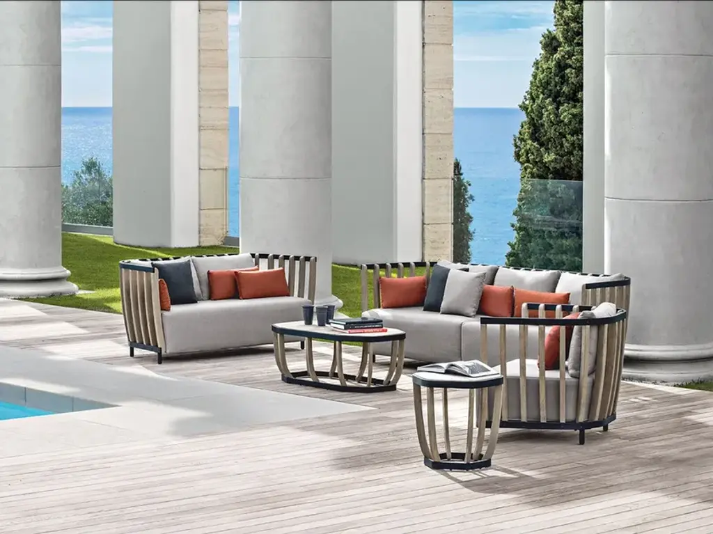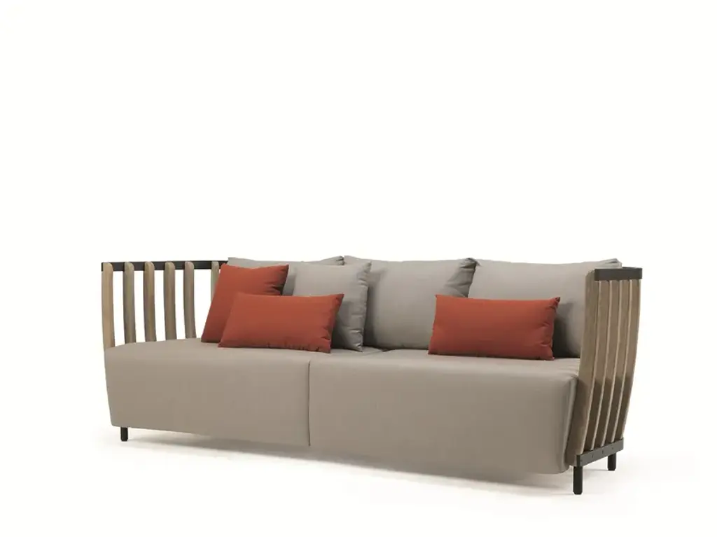 SWING sofas - Two or three seater or corner sofa in pickled teak and black aluminium. Waterproof Acrylic tissue.Rain cover available.The partnership between Patrick Norguet and Ethimo has resulted in Swing, a lounge collection characterised by a dual structure: an external metal one and an internal one using pickled teak slats, like a nest cocooning the body and mind.