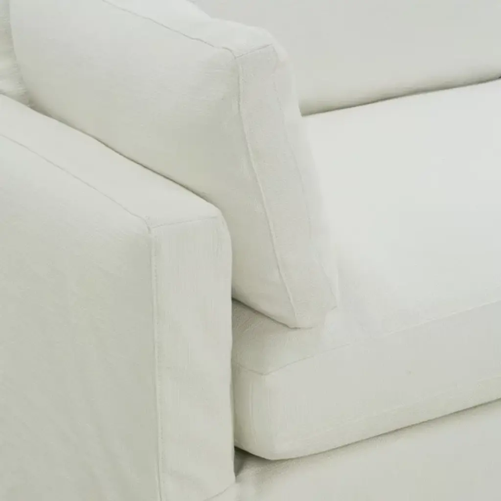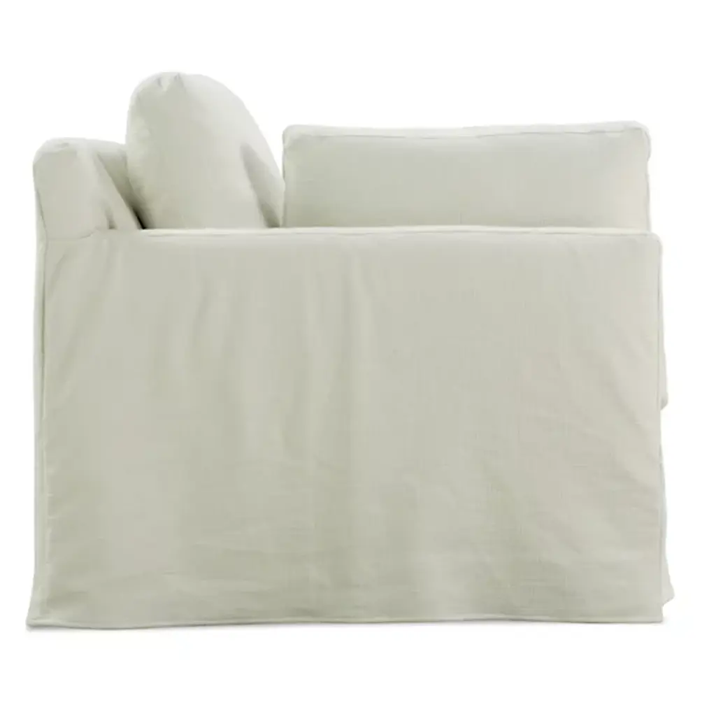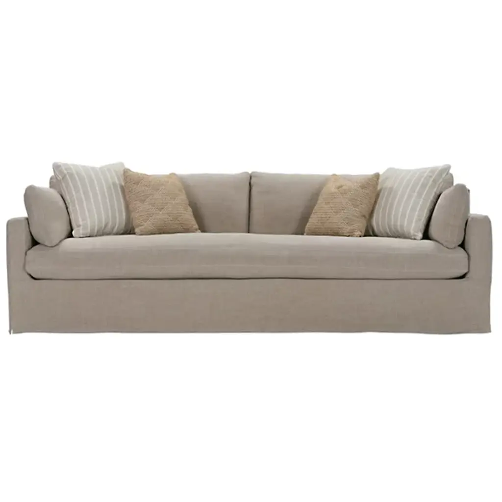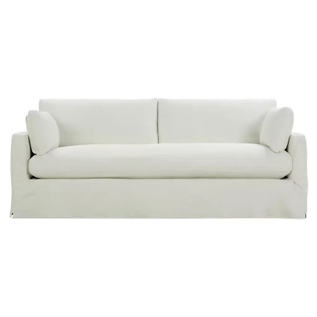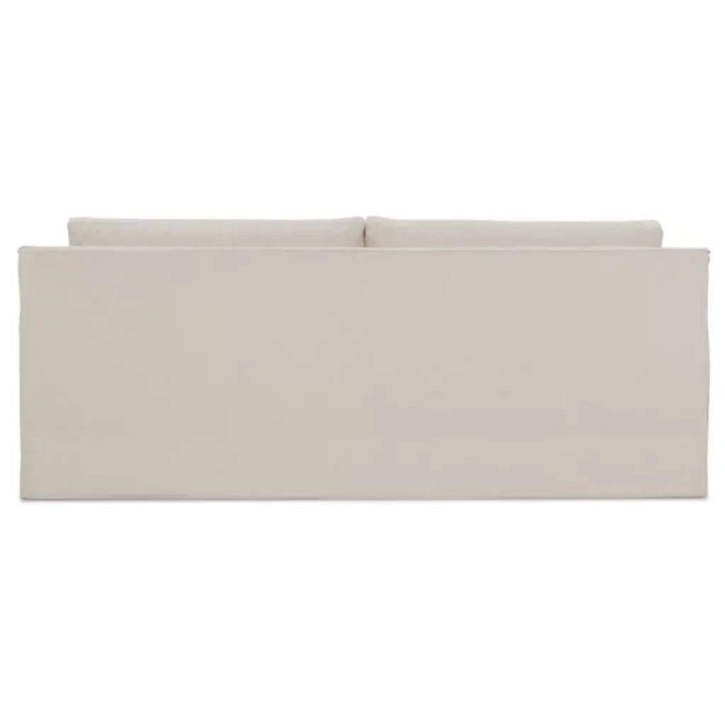 Experience the perfect fusion of transitional and contemporary styles with the Sylvie Slipcover Sofa from Rowe Furniture. It features premium upholstery, durable plastic legs, and high-resiliency foam cushions that are partially plant-based. It has a durable wooden frame for stability. This sofa offers both elegance and comfort. Proudly made in the USA, it exemplifies top-tier craftsmanship. Elevate your living space with the timeless charm of this versatile piece, which complements various settings.