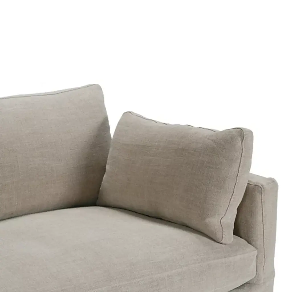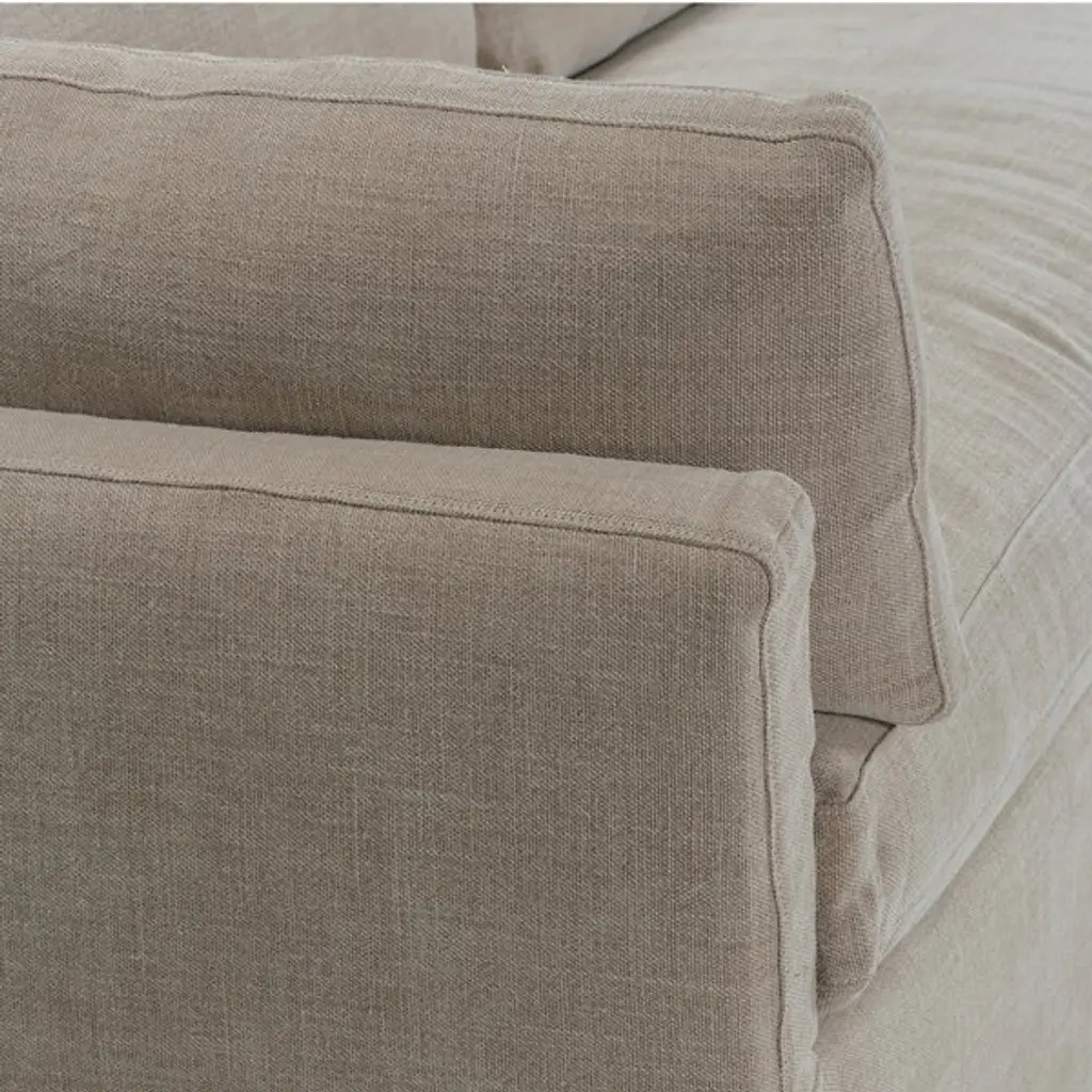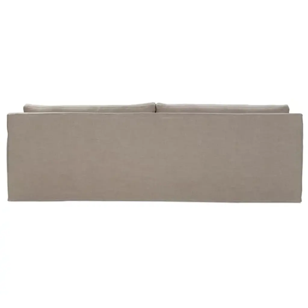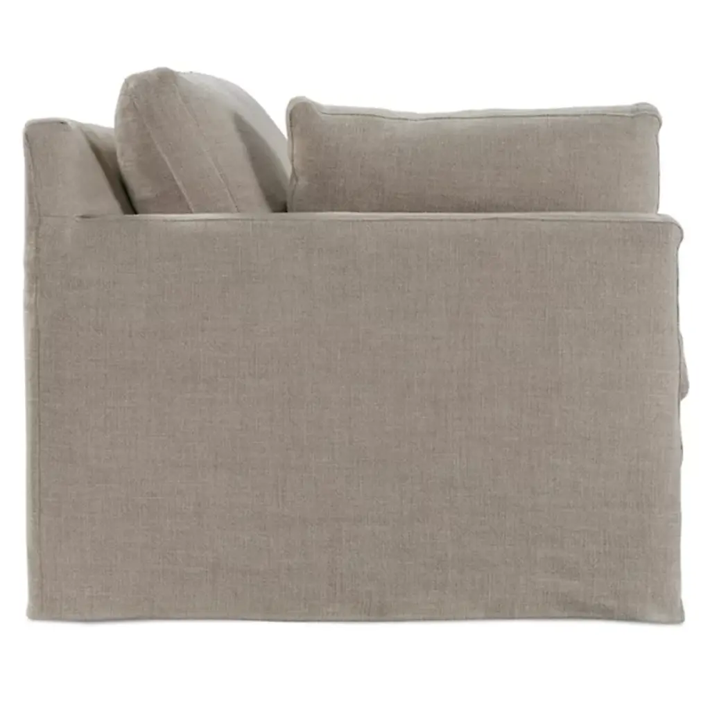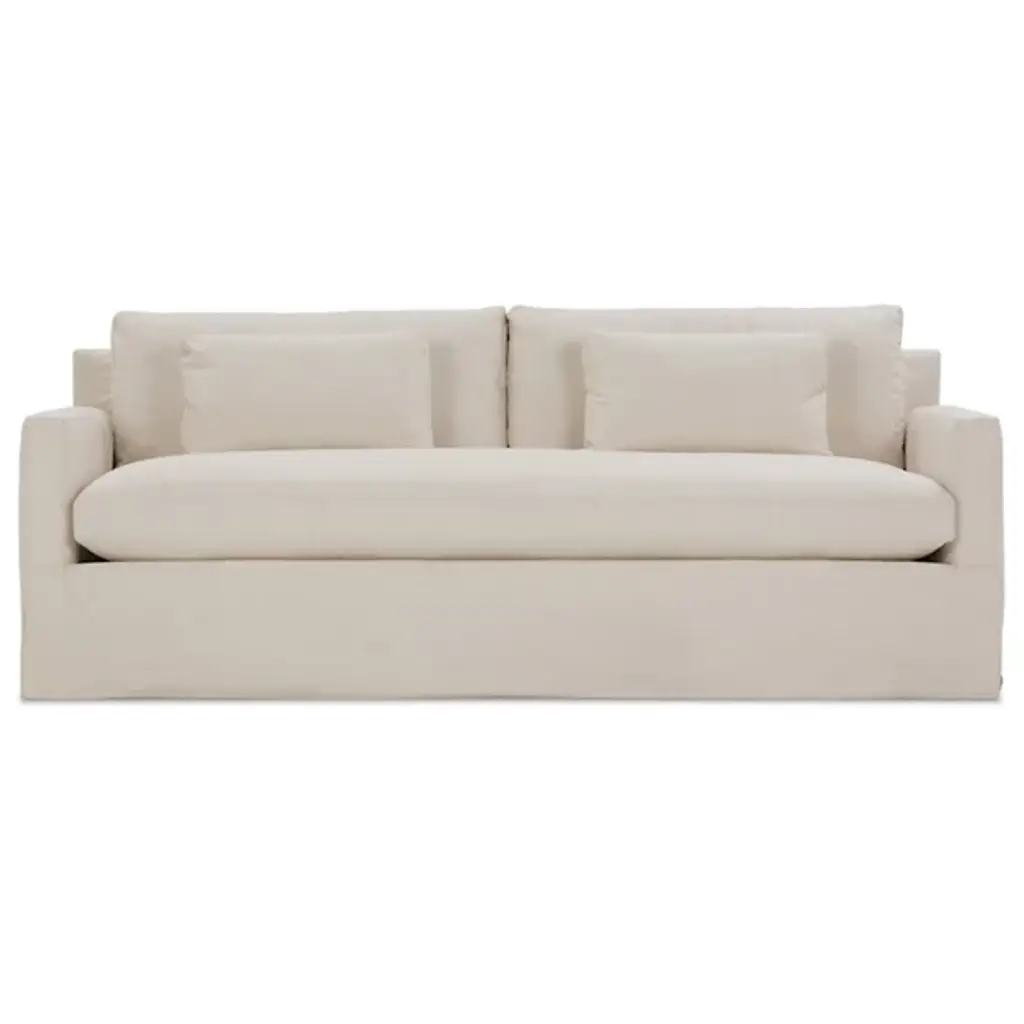 Experience the perfect fusion of transitional and contemporary styles with the Sylvie Slipcover Sofa from Rowe Furniture. It features premium upholstery, durable plastic legs, and high-resiliency foam cushions that are partially plant-based. It has a durable wooden frame for stability. This sofa offers both elegance and comfort. Proudly made in the USA, it exemplifies top-tier craftsmanship. Elevate your living space with the timeless charm of this versatile piece, which complements various settings.