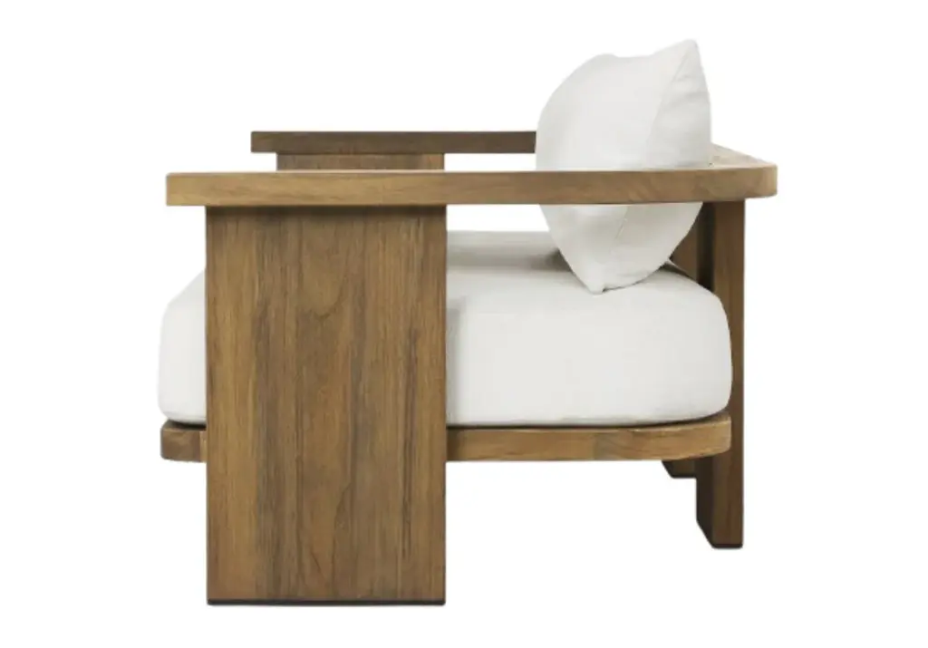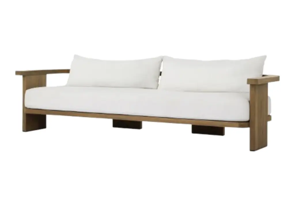 A sculptural addition, this outdoor sofa features a clean, curved form crafted from teak wood. A comfortable back and seat cushion give simple sophistication, styling well on decks and patios.