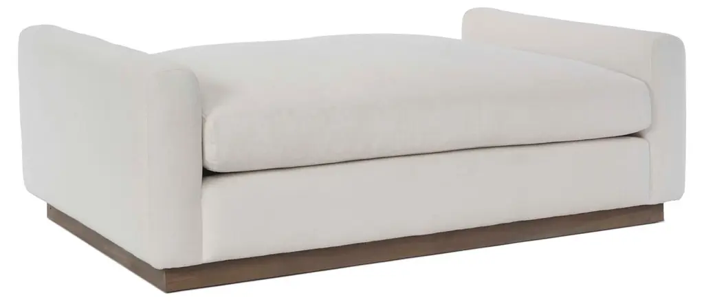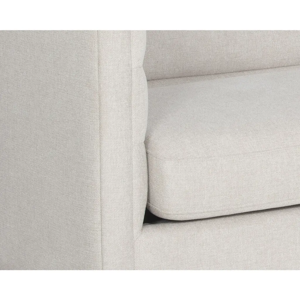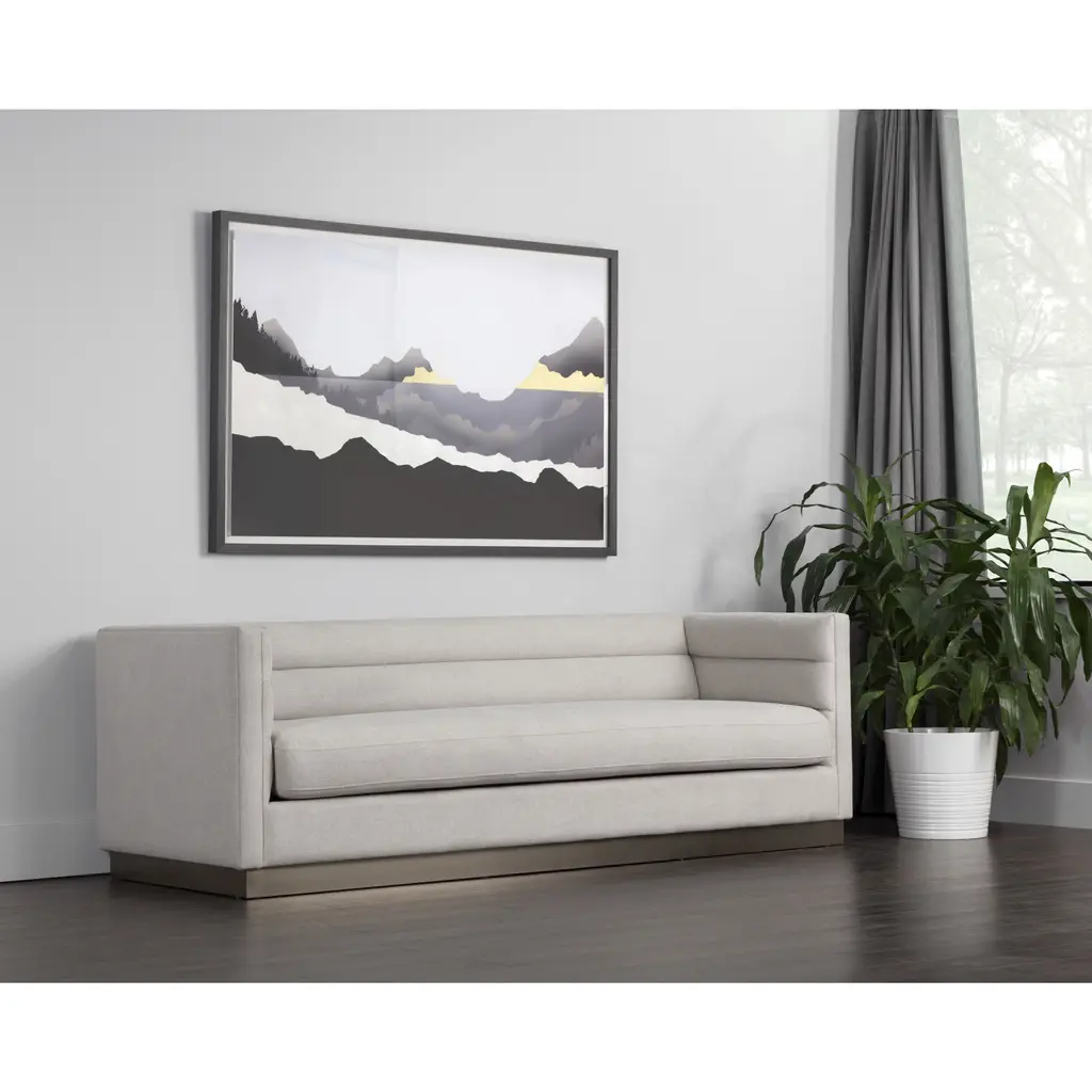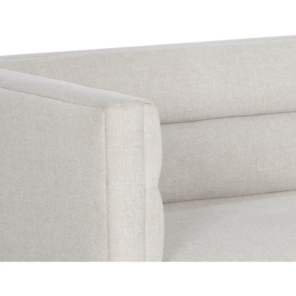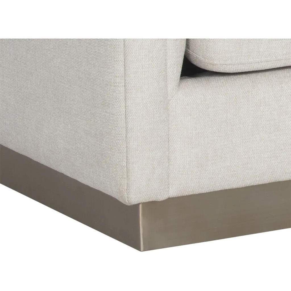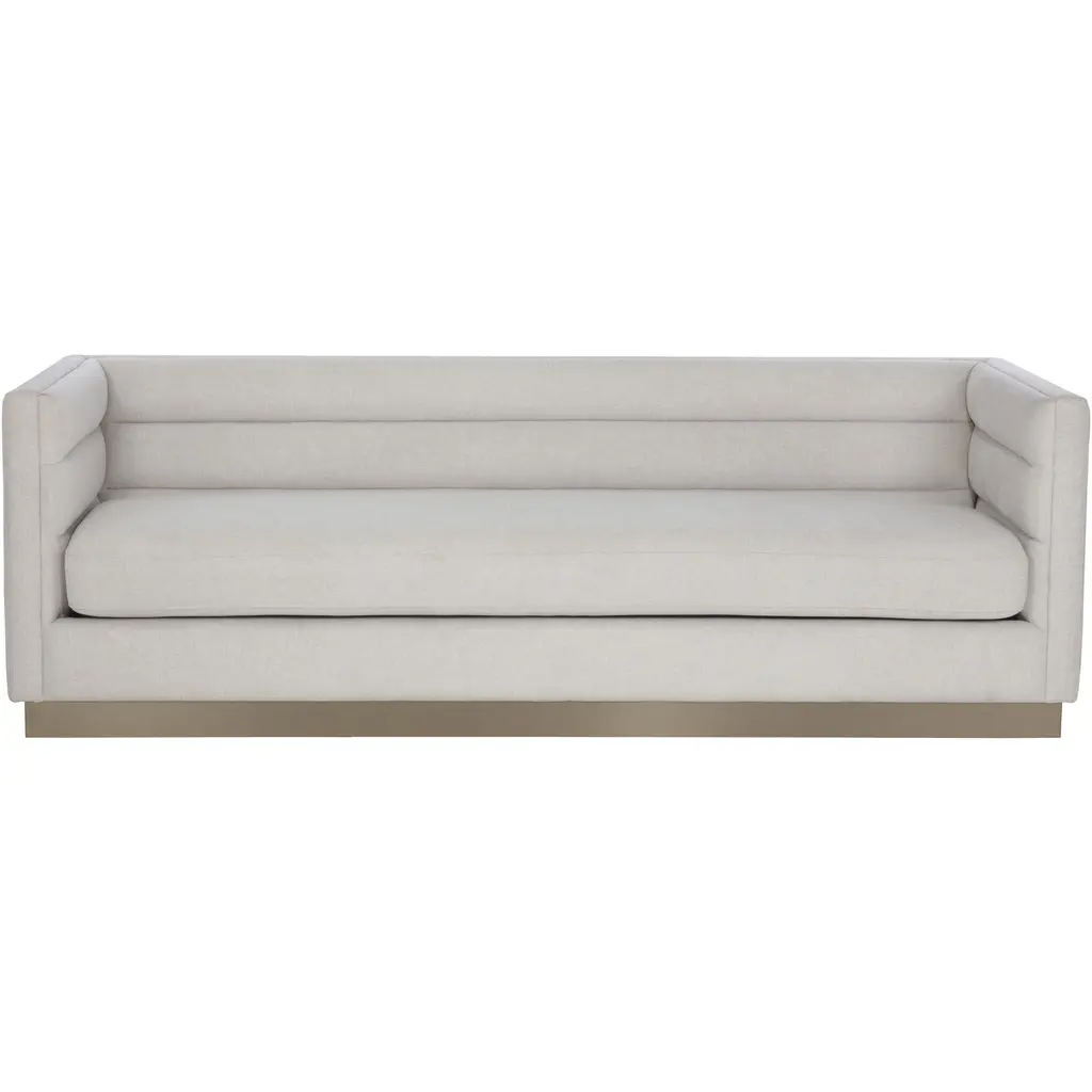 This stunning sofa offers a streamlined design for contemporary elegance. Stocked in belfast oatmeal fabric with horizontal tufting on the interior seatback. Completed with an antique brass stainless steel base.