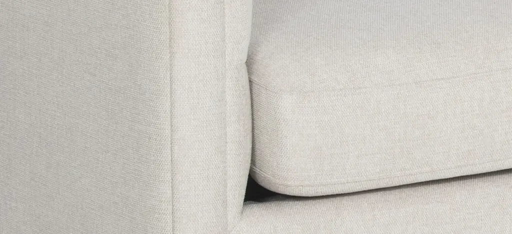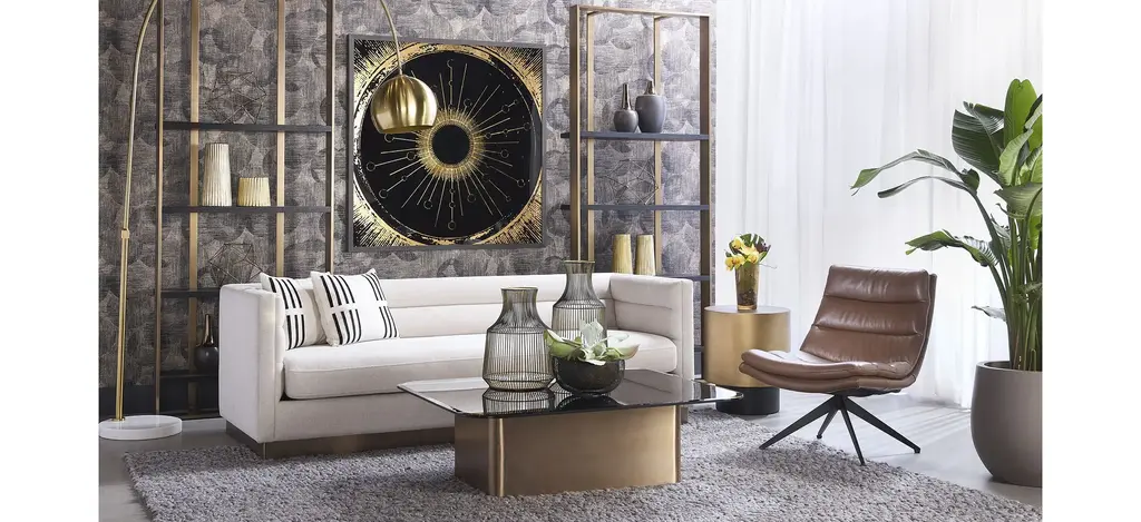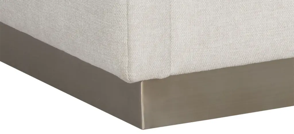 This stunning Talbot Sofa offers a streamlined design for contemporary elegance. Stocked in luxurious fabric with horizontal tufting on the interior seatback. Completed with an antique brass stainless steel base.