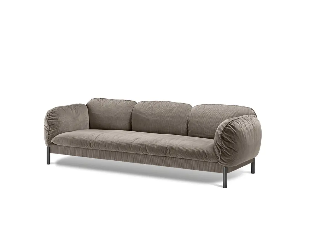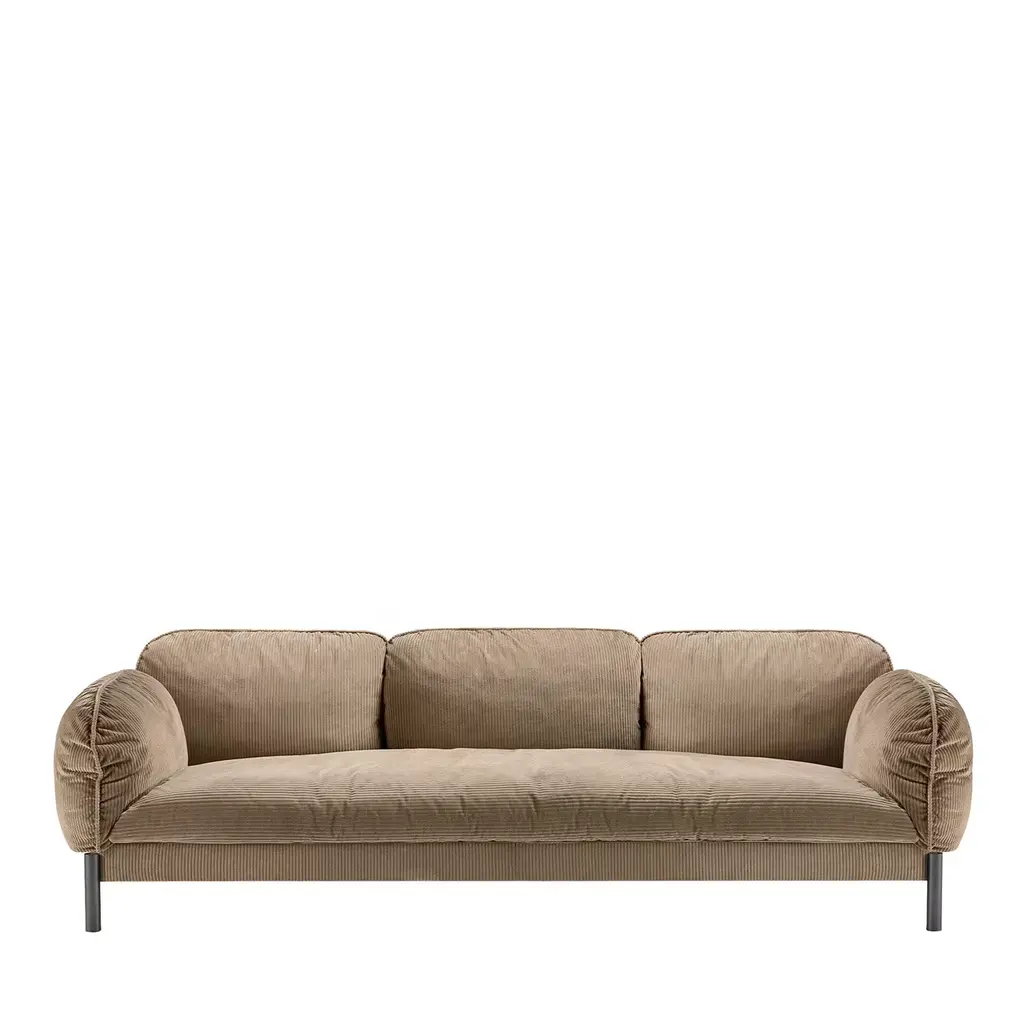 Soft and welcoming, this sofa is inspired by the 70’s; a decade that changed our culture forever through freedom and self-discovery. The Sofa invites you to a world of fantasy where you can indulge in the comfort and coziness of your passions.Tarantino, as if following a skillful plot, lends itself to composing various original and alternative solutions integrated by the soft goose down cushions covered with textured cotton corduroy proposed in colors inspired by the 70s.Structure: Aluminum legs fixed on internal metal frame, aluminum side support. Cushions: Back cushions in high grammage wadding with internal rubber insert, covered with a quilted goose down in cotton lining. Seat cushions in polyurethane rubber of different densities covered with a quilted goose down in cotton lining. Covers: Covers are not removable. Base: The sofa, armchair and ottoman are made of Italian aluminum, bent in-house at Ghidini1961. Polished manually, and lacquered with a transparent finish to guarantee a long lasting durability.Additional Information:Materials: Brass, fabric Upholstery: Cord CA1419/091Legs Finish: Black goldDimensions: W 270 x D 110 x H 79 cmAvailable in other upholstery options: Nabuk leather, nappa leather, natural leather, velvetAvailable in other finish option: Brown burnished brass, polished brass, satin brass, light burnished brass, dark burnished brass