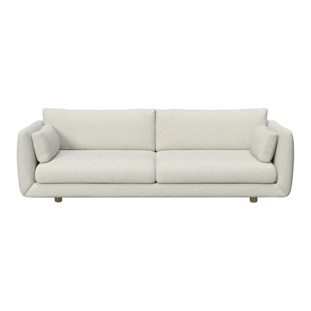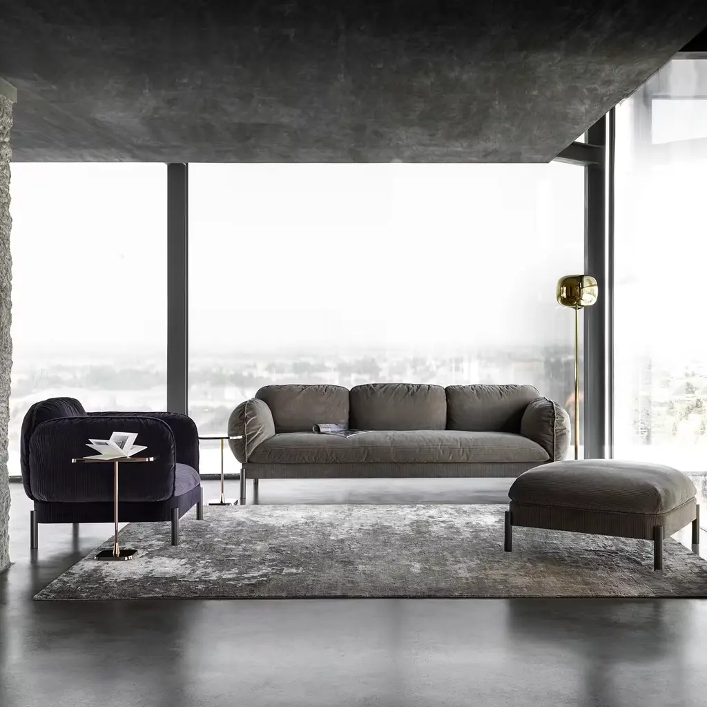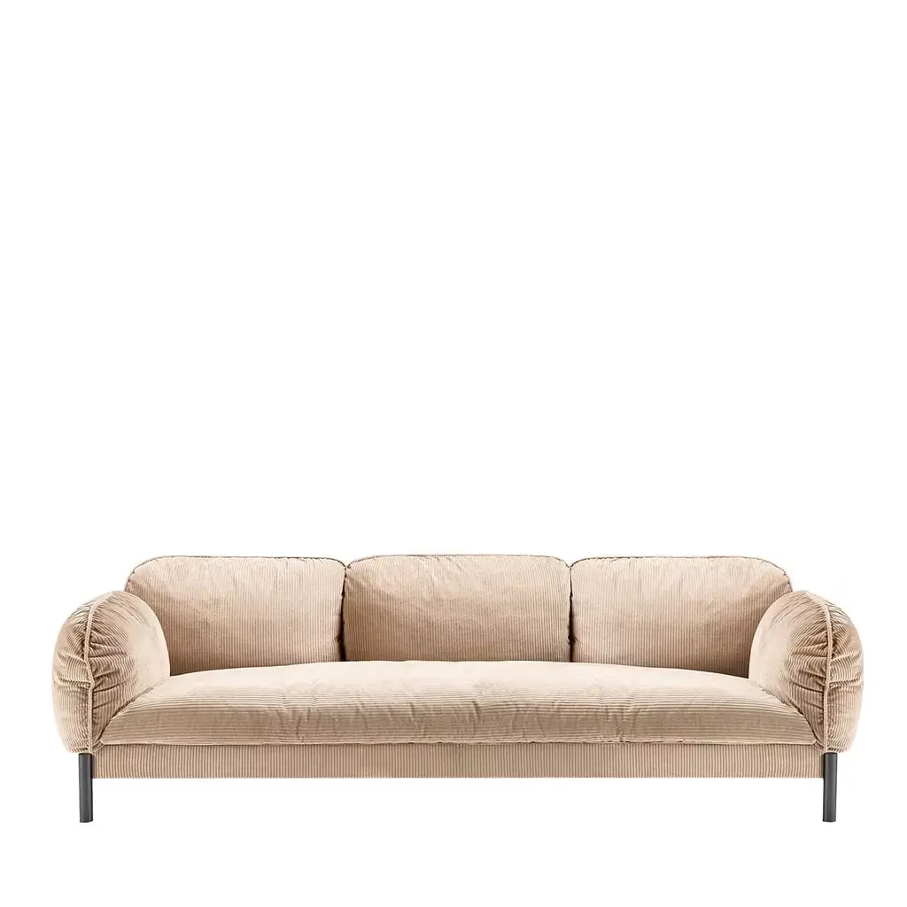 Elegant and modern yet inspired from a classic shape, this three-seat sofa will be a precious addition to a contemporary interior, welcoming anyone with its comfortable and enveloping silhouette. resting on black satin-finished cylindrical feet, the piece is softly padded and entirely upholstered with a textured and velvety brown fabric, available for customization, please ask the Concierge for further details. For the US market, please contact the Concierge for CAL TB 117 certified fabrics.