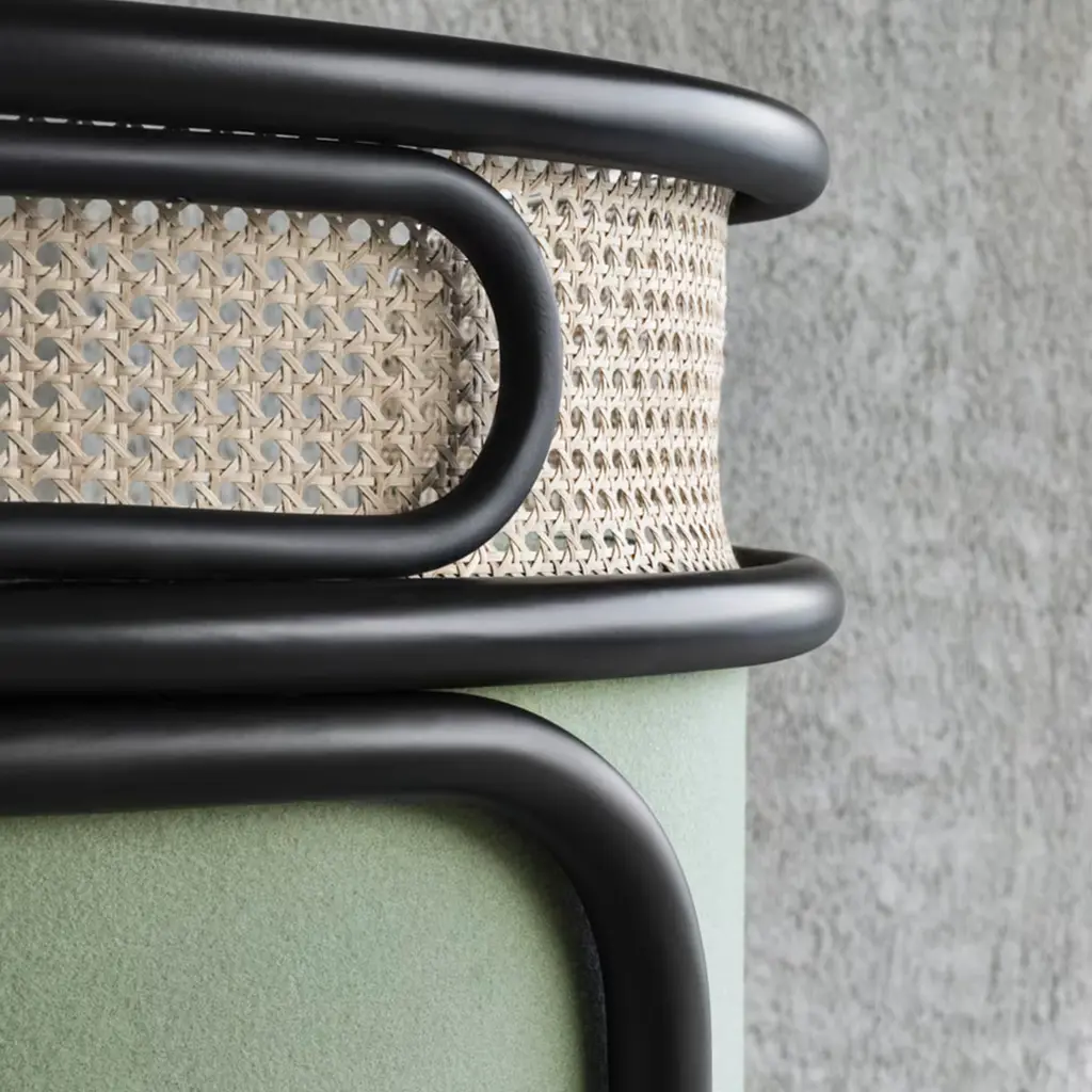 Combining the iconic Thonet's steam-bent beechwood that creates a unique enveloping frame, this sofa was designed by the Italian-Danish designer duo GamFratesi in 2015. Equally stunning in a public space that prefers an intimate effect or as a magnificent statement in an eclectic home, this sofa will be eye-catching. Thonet's iconic trademark coexist in this piece that combines Viennese straw elements with steam-bent beechwood. Mixing sinuous curves and straight lines, plush cushions and minimalist accents, this piece will make a statement in any interior.