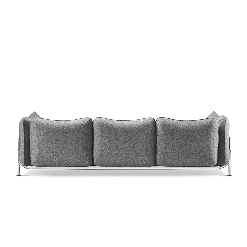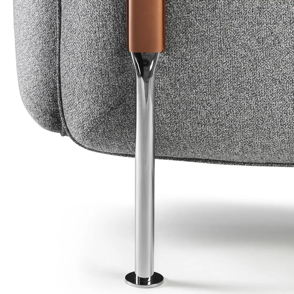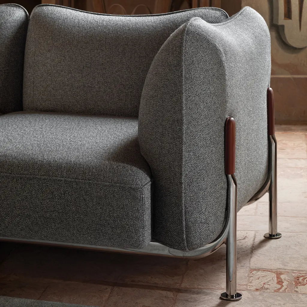 Sinuous curves trace the profiles of plump perimeter cushions in this sophisticated modern sofa promising unrivaled comfort experiences. Precious leather pockets enrich the gleaming metal structure where the seat is nested, materials carefully selected for revealing a special inspiration drawn from elegant equestrian accessories. An armchair counterpart is also available in the Artemest catalog.