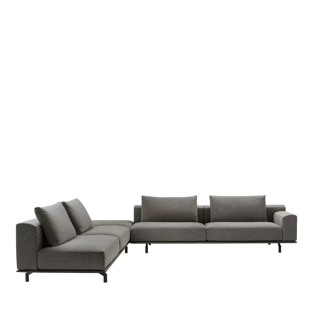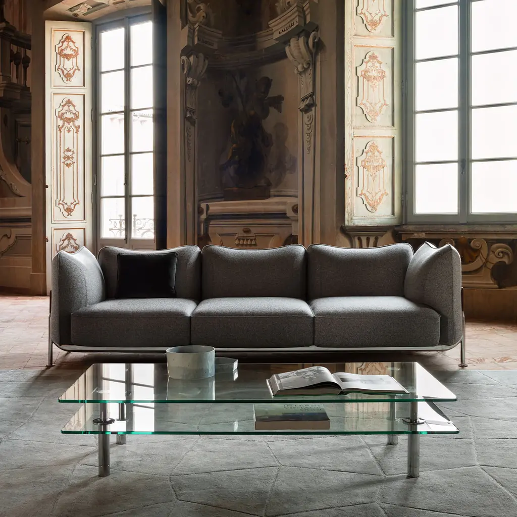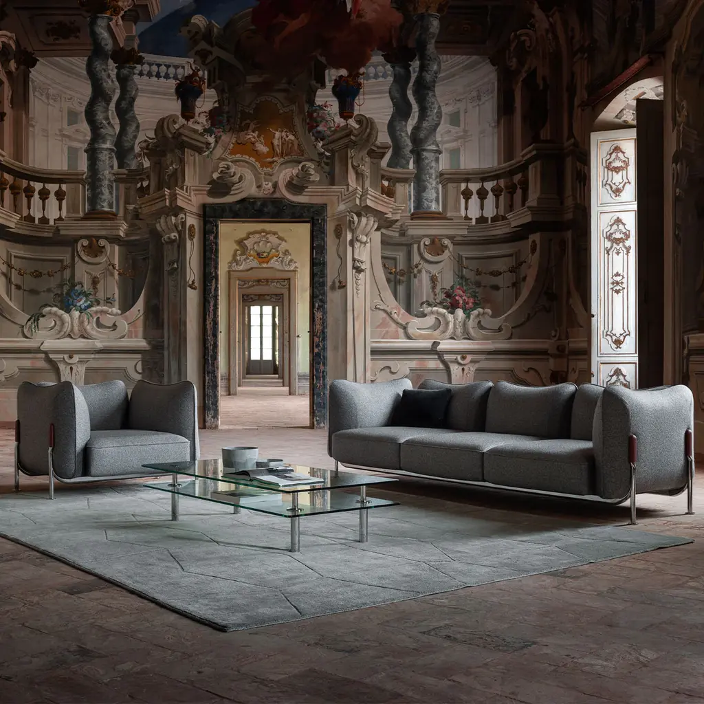 Sinuous curves trace the profiles of plump perimeter cushions in this sophisticated modern sofa promising unrivaled comfort experiences. Precious leather pockets enrich the gleaming metal structure where the seat is nested, materials carefully selected for revealing a special inspiration drawn from elegant equestrian accessories. An armchair counterpart is also available in the Artemest catalog.