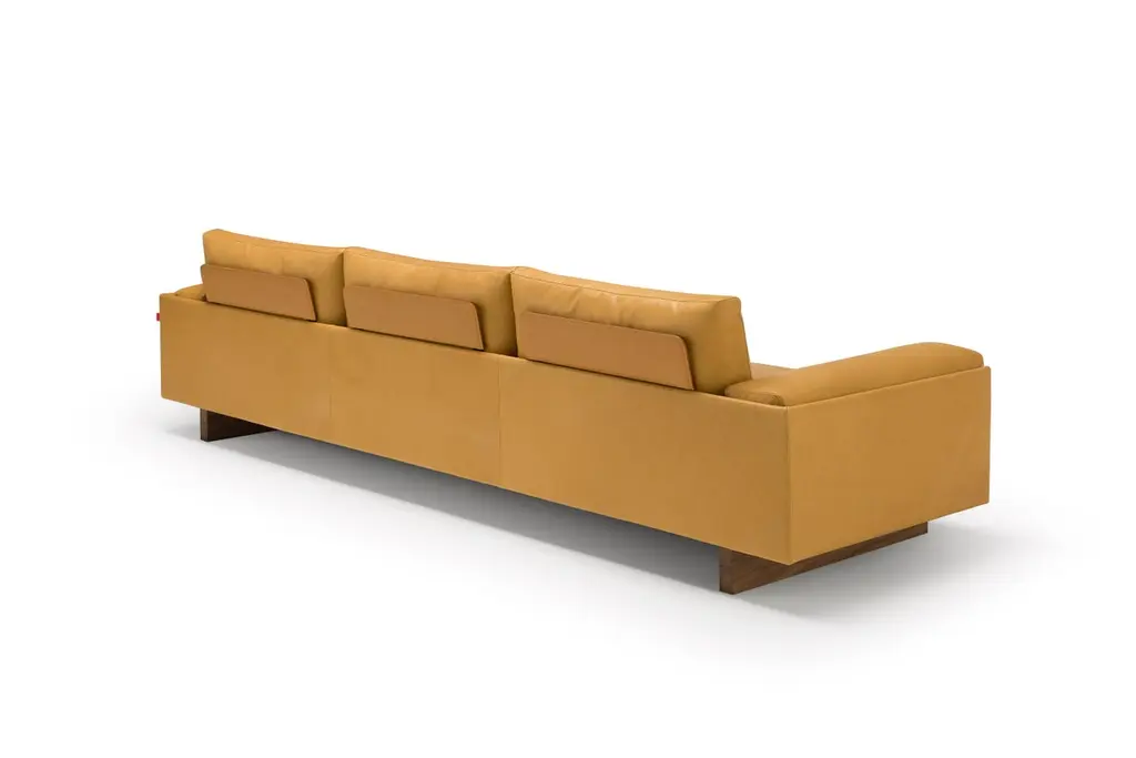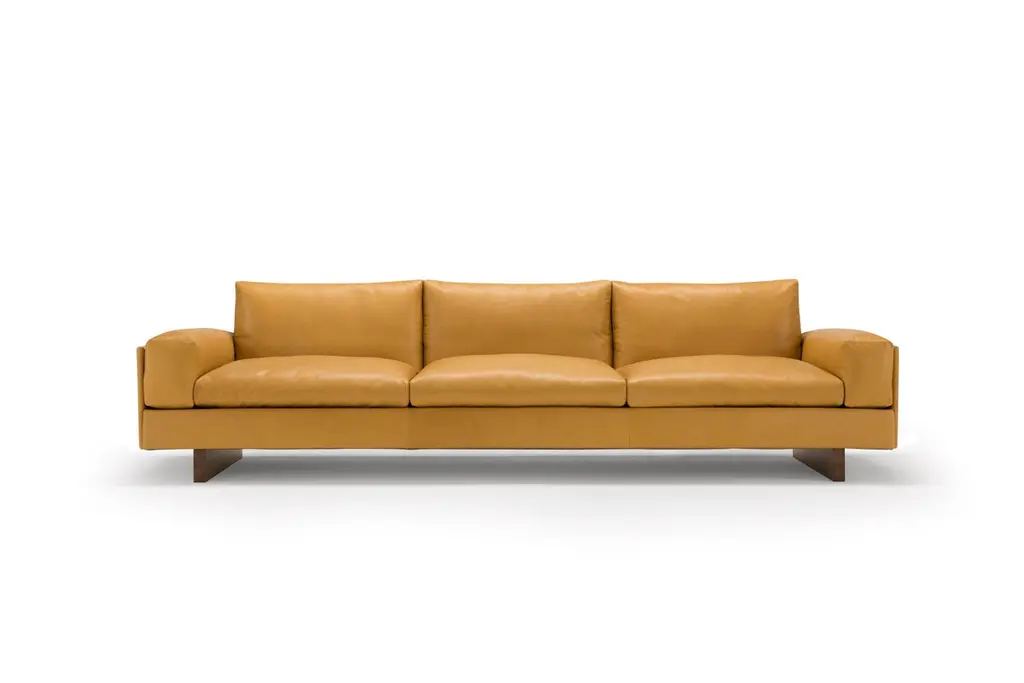 Tau Leather Sofa 4 Seater by Amura LabDimensions: W 285 x D 90 x H 75 cmMaterials: FRAME: solid wood and multiply. SUSPENSIONS: rubber and polypropylene belts. REMOVABLE PARTS: fully slipcover. SEAT, BACK and ARMRESTS: polyurethane foam, density 30 kg/m3 and Mollapiuma.Born from the experience and observation of the oriental lifestyle The last letter of the Greek alphabet, but also a symbol rich in religious and spiritual meanings, TAU was born from the experience and observation of the oriental lifestyle: "if we sit on the ground the sky will seem even higher". Simplicity and linearity are the stylistic features of TAU . The sofa perfectly expresses softness and comfort through a timeless design: large soft cushions, low and comfortable almost enclosed in a rigid "tray" that accommodates them.Amura Lab:In their gaze, they carry the strong and poignant beauty of Southern Italy. In their hands, the passion and careful craftsmanship with which they create timeless design environments, capable of combining the memory of their origins with the future of design.It is within this microcosm made of culture, ever-present traditions, artistic influences, and continuous innovation that Amura was born, the Made in Italy furniture brand that embodies the strong and authentic beauty of Southern Italy. A young company that passionately and meticulously pursues the creation of environments with a timeless design, capable of merging the memory of its origins with the future of design. From the careful selection of materials to the pursuit of innovative designs, each phase of creation carries the indelible mark of the most authentic atmospheres of the South