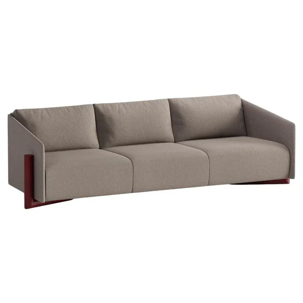 Taupe grey timber 4 seater sofa by kann design dimensions: d 104.5 x w 260 x h 75 cm. Materials: solid wood, elastic belts, hr foam, fabric upholstery kvadrat vidar 143 (94% wool, 6% nylon). Available in other fabrics. the strong presence of textile in the timber collection gives it the appearance of a comfortable cloud that seems to levitate above the ground. The wooden structure disappears under the furniture to appear only at the back and on each side of the armrests, playing on the resemblance to the roots of a tree. The character and dynamism of the furniture is reinforced by the choice of a two-color between the textile and the wood.