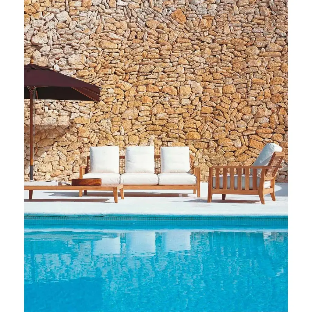 Indulge in the luxury of the Teak Minimalist Outdoor Sofa by Unopiu Synthesis. Made from exquisite teak wood and WaProLace, this 210cm sofa exudes sophistication and elegance. Enhance your outdoor space with this minimalist yet stylish addition, perfect for relaxing or entertaining in style.