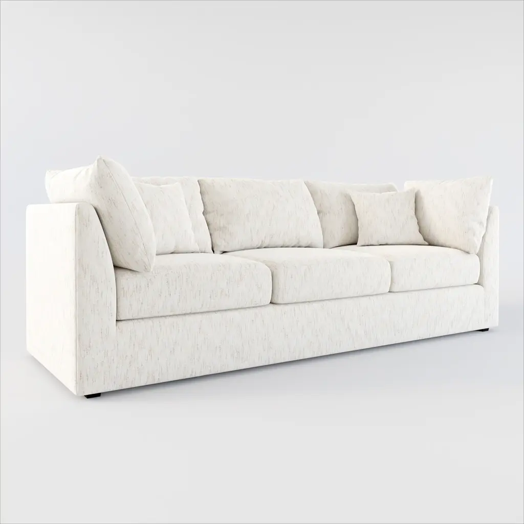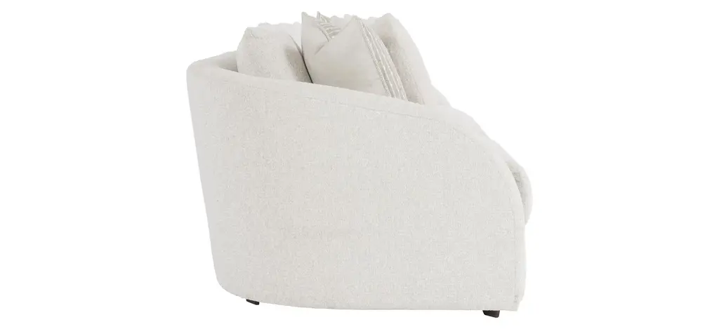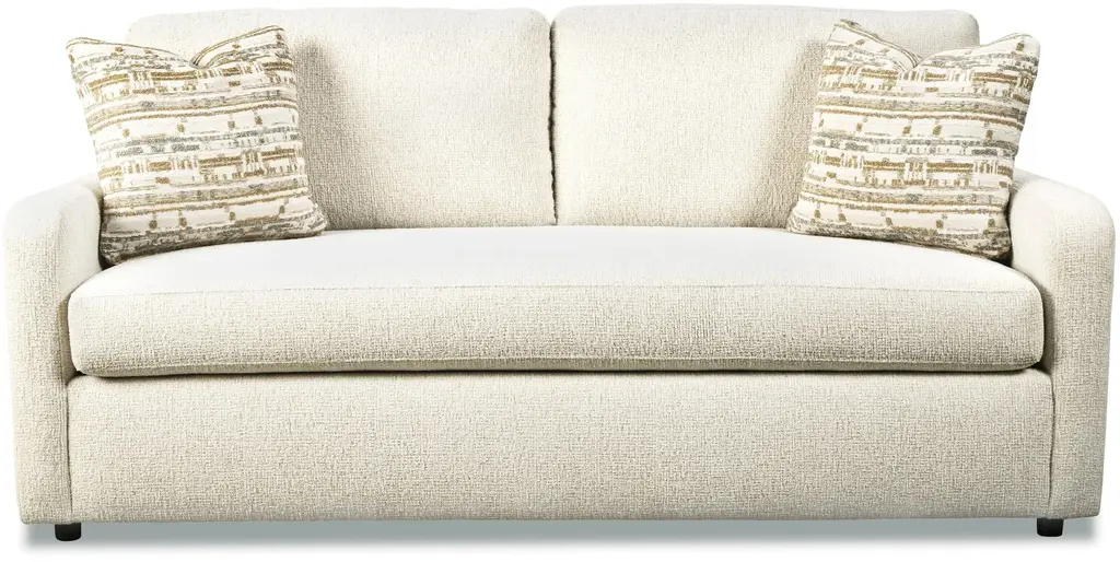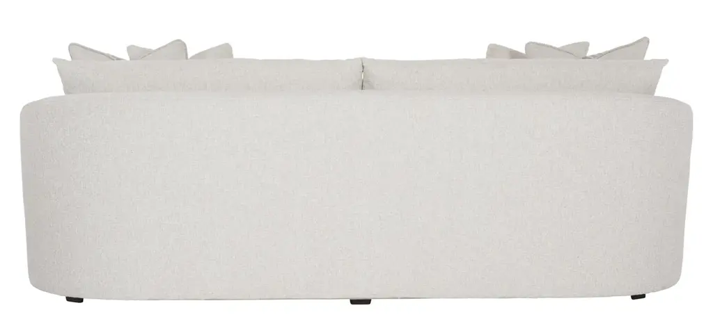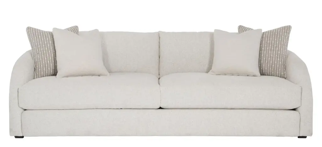 Terra sofa has inviting plump cushions and throw pillows, all supported by unobtrusive wood feet. Sloping and curved arms further the sophisticated yet understated look making this versatile sofa an easy choice for a formal or casual space.