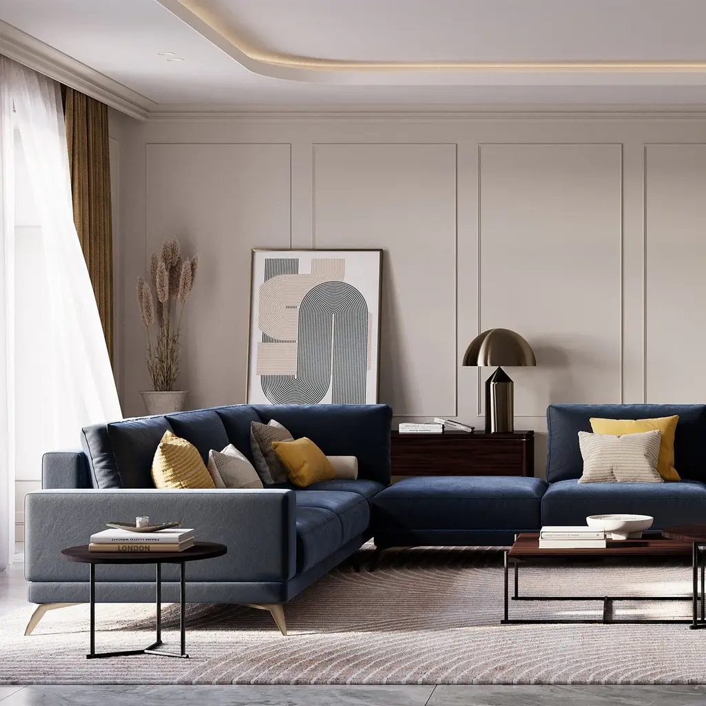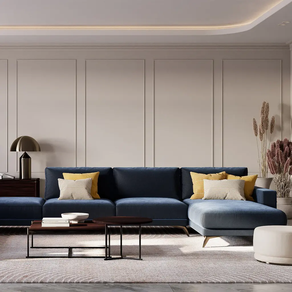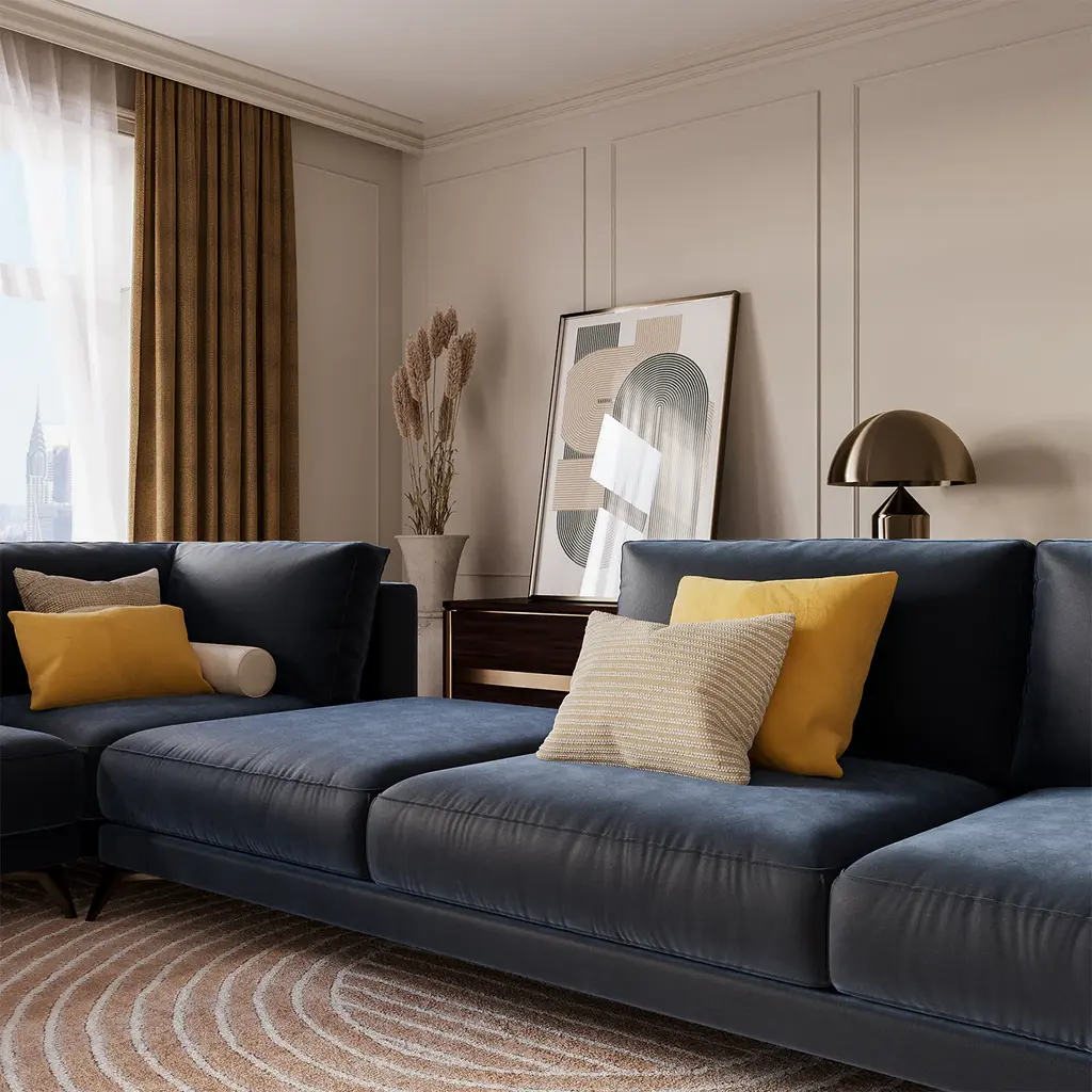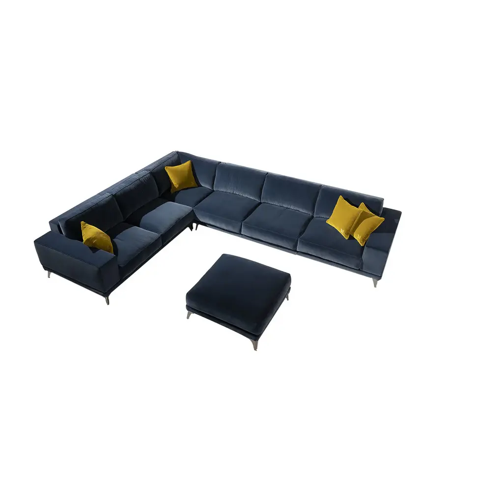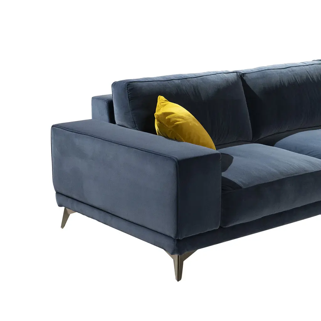A sofa be a decorative piece as well as useful, as proves this gorgeous contemporary modular sofa from the Cosmopolitan collection, in a dark blue cotton velvet. Timeless class and sophistication characterize this sofa, which has raised graphite-colored metal legs, and plush goose feather and polyurethane backrest and seat cushions for guaranteed comfort.