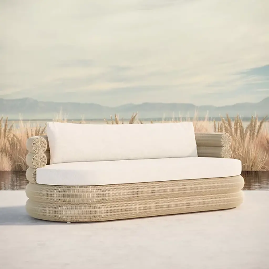 Artisanal modern allure meets breezy nautical style in the handcrafted Texoma Outdoor 3 Seater Sofa from Azzurro Living. Intricately woven all-weather resin wicker and performance fabric in an oval arrangement balances coastal vibes with contemporary elegance. Generously proportioned for comfort, Texoma blends versatile luxury with impeccable craftsmanship optimized for indoor and outdoor life. The sofa harmonizes classic glamour with modern lines and provides a soft and comfortable style perfect anywhere relaxation beckons.