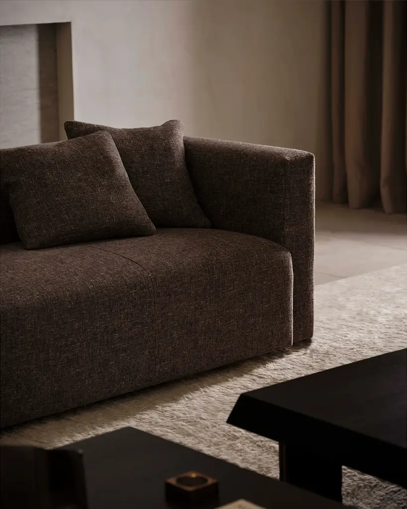 The Breuer Sofa draws inspiration from the bold and graphic shapes of brutalist design. Tightly upholstered for a sleek look, it has a low-lying seat accompanied by plush throw pillows. Handcrafted in North Carolina.