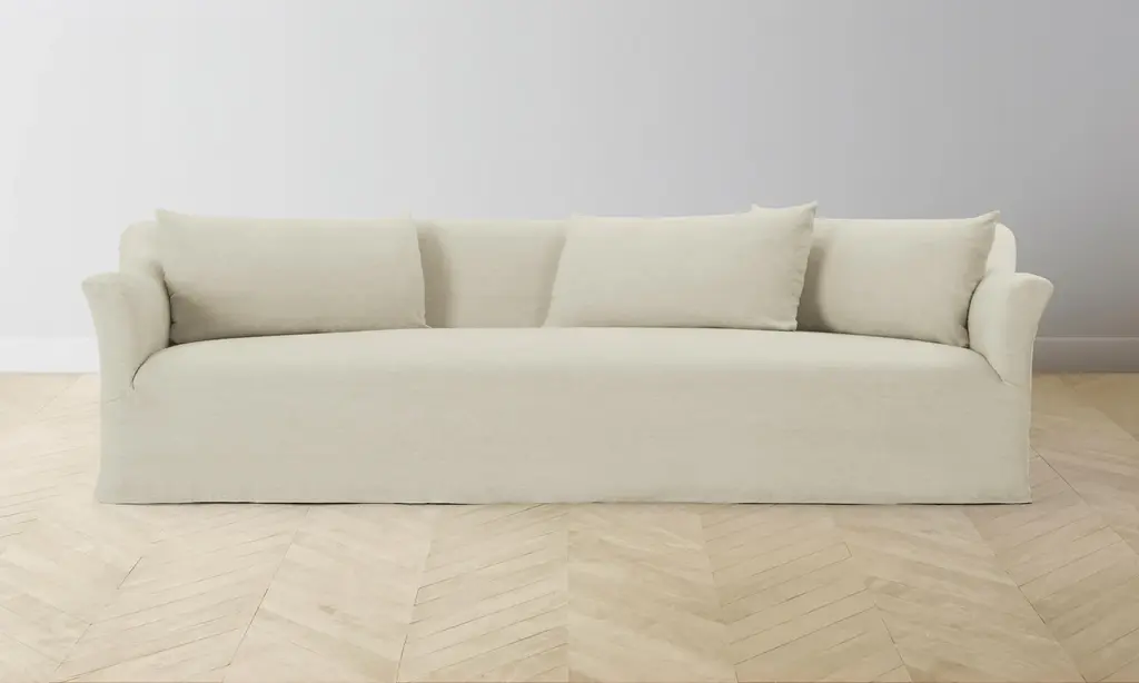 The Breuer Sofa draws inspiration from the bold and graphic shapes of brutalist design. Tightly upholstered for a sleek look, it has a low-lying seat accompanied by plush throw pillows. Handcrafted in North Carolina.