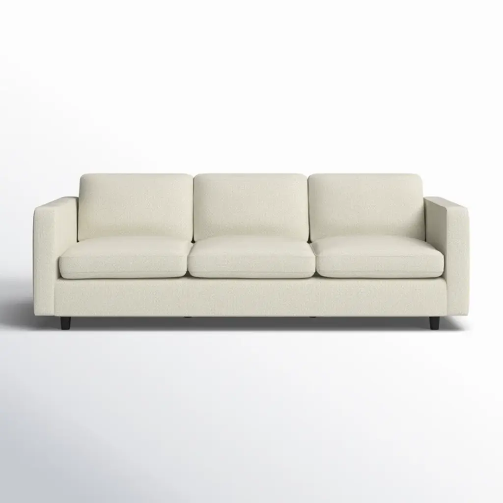 The Breuer Sofa draws inspiration from the bold and graphic shapes of brutalist design. Tightly upholstered for a sleek look, it has a low-lying seat accompanied by plush throw pillows. Handcrafted in North Carolina.