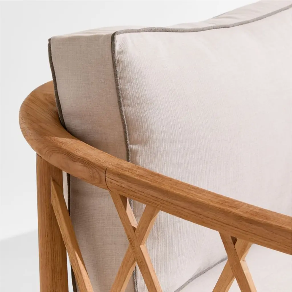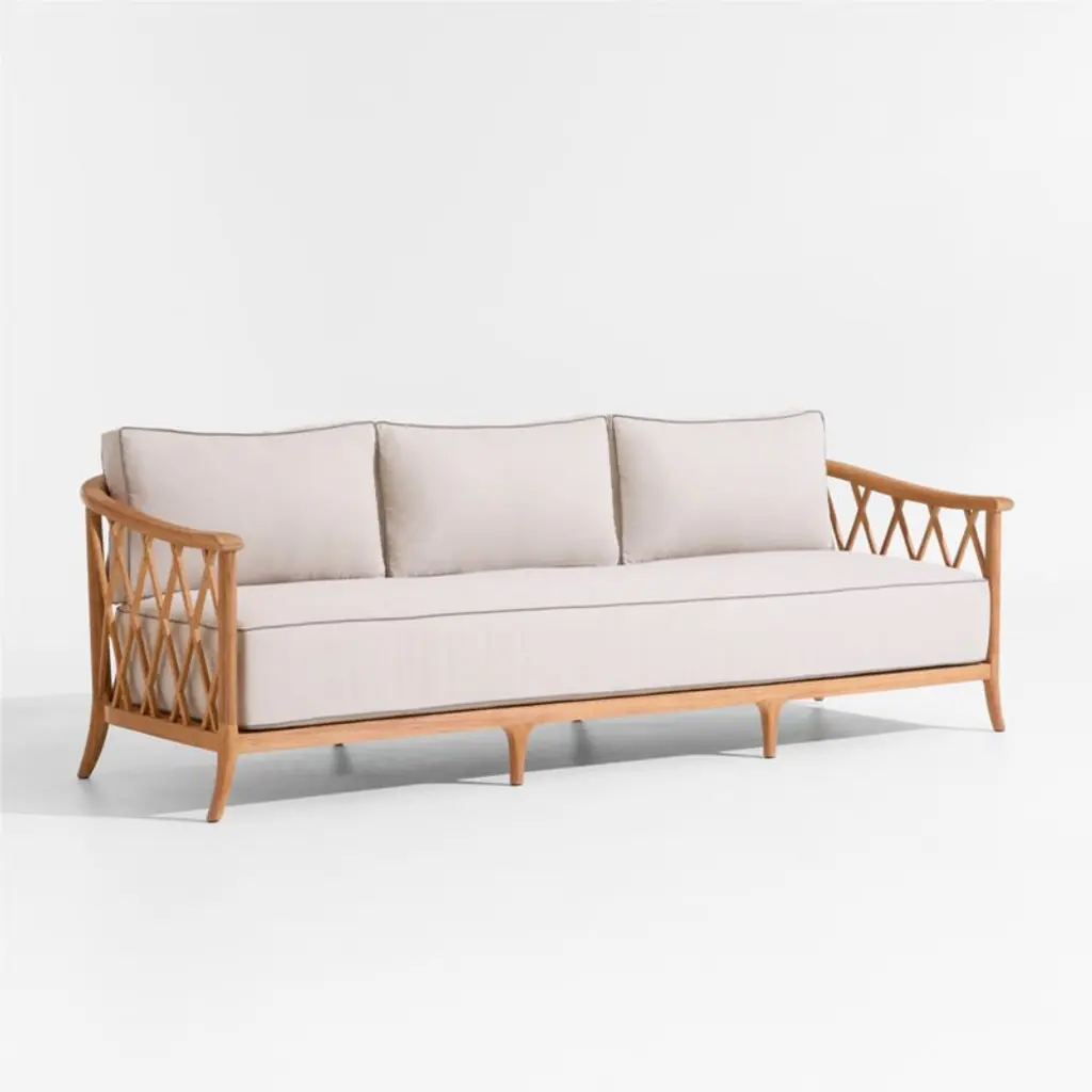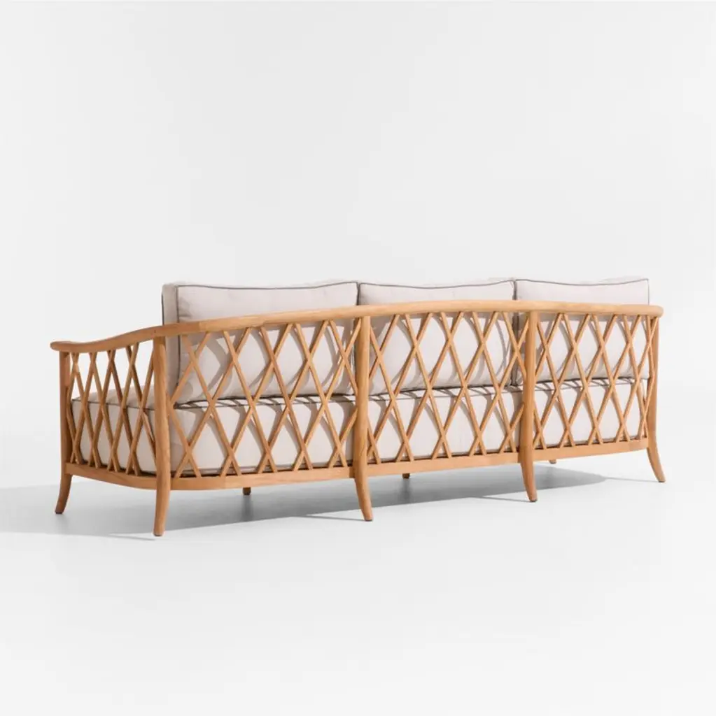 Recalling vintage European garden furniture, the Harper sofa refines outdoor lounging with high style and extra-deep, sink-in cushions. The sustainable teak frame stands on gracefully flared legs as it shapes a curved back detailed with a breezy, trellis-inspired lattice pattern. The thick bench cushion provides a slightly firm, supportive seat with soft, fiber-filled back box cushions for added comfort. Bordered with contrast welting in taupe, the well-tailored cushions feature natural-toned performance fabric woven with a slight slub for a touch of texture.Jake Arnold's first-ever outdoor collection elevates your oasis with his fresh L.A.-meets-London style. Think insider-worthy details, real-life comfort and materials chosen to weather the elements.If left uncovered and untreated, natural teak will patina to a beautiful silvery grey.