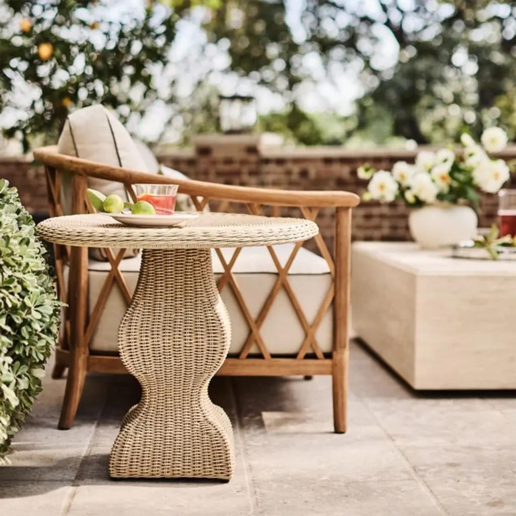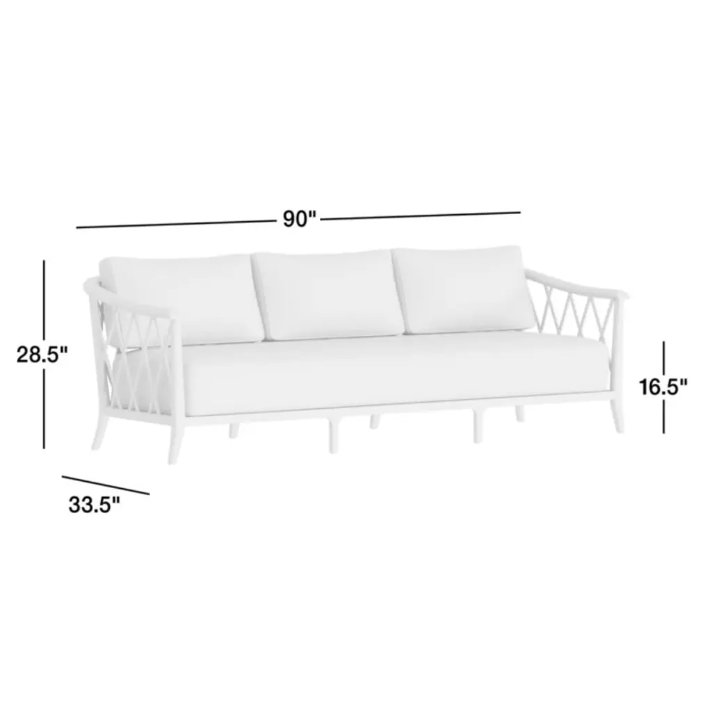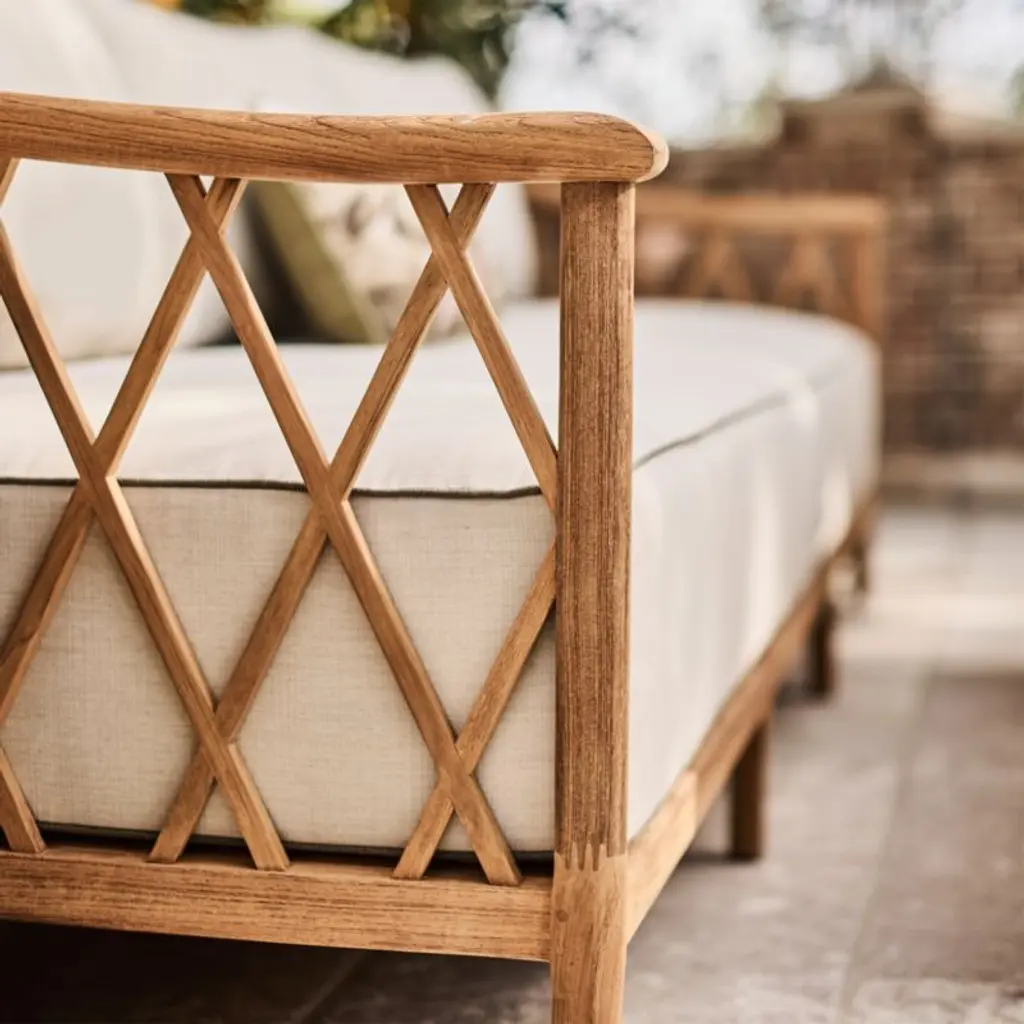Recalling vintage European garden furniture, the Harper sofa refines outdoor lounging with high style and extra-deep, sink-in cushions. The sustainable teak frame stands on gracefully flared legs as it shapes a curved back detailed with a breezy, trellis-inspired lattice pattern. The thick bench cushion provides a slightly firm, supportive seat with soft, fiber-filled back box cushions for added comfort. Bordered with contrast welting in taupe, the well-tailored cushions feature natural-toned performance fabric woven with a slight slub for a touch of texture.Jake Arnold's first-ever outdoor collection elevates your oasis with his fresh L.A.-meets-London style. Think insider-worthy details, real-life comfort and materials chosen to weather the elements.If left uncovered and untreated, natural teak will patina to a beautiful silvery grey.