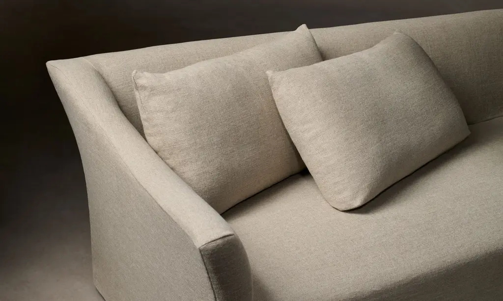 Cloaked in a beautifully draped slipcover, the Leonard Sofa is an embodiment of relaxed elegance. It has a flared frame traced with sloping lines that lend softness to the design. Handcrafted in North Carolina.
