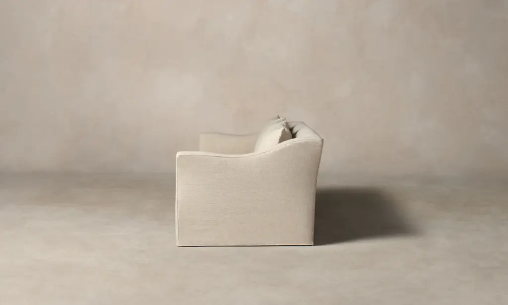Cloaked in a beautifully draped slipcover, the Leonard Sofa is an embodiment of relaxed elegance. It has a flared frame traced with sloping lines that lend softness to the design. Handcrafted in North Carolina.