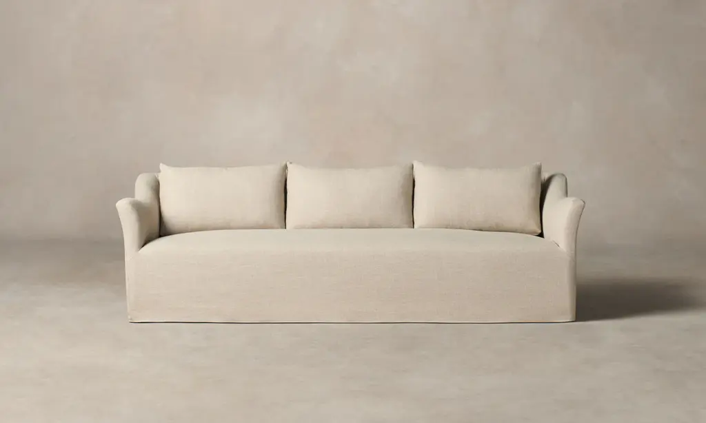 Cloaked in a beautifully draped slipcover, the Leonard Sofa is an embodiment of relaxed elegance. It has a flared frame traced with sloping lines that lend softness to the design. Handcrafted in North Carolina.