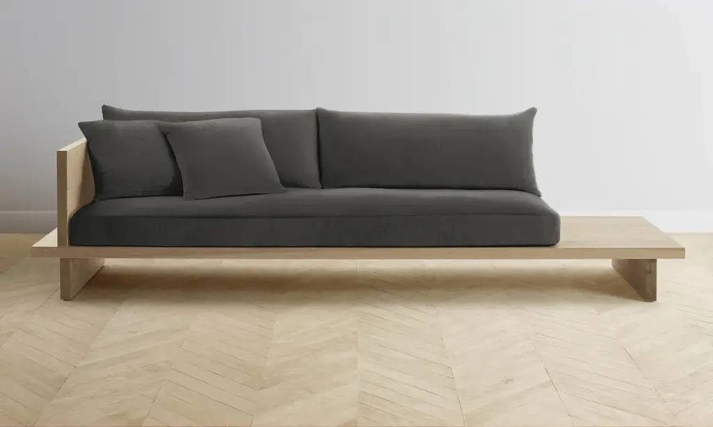 From the woodwork to the tailoring, every element of the Muir Sofa is a display of exquisite artisanship. Its angular frame extends beyond the seat cushion, allowing space for decorative objects or necessities. Handcrafted in North Carolina.
