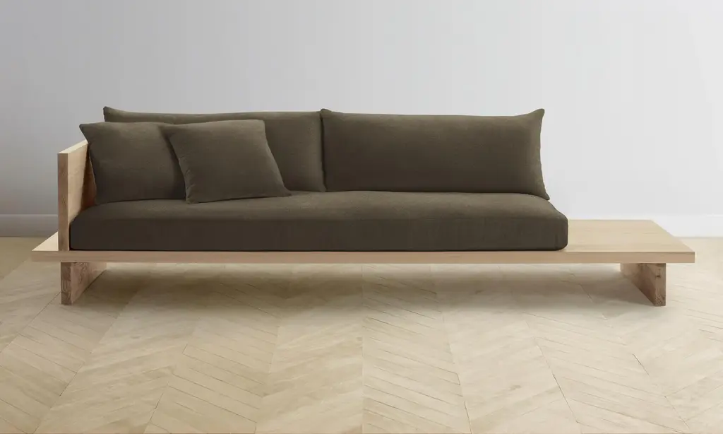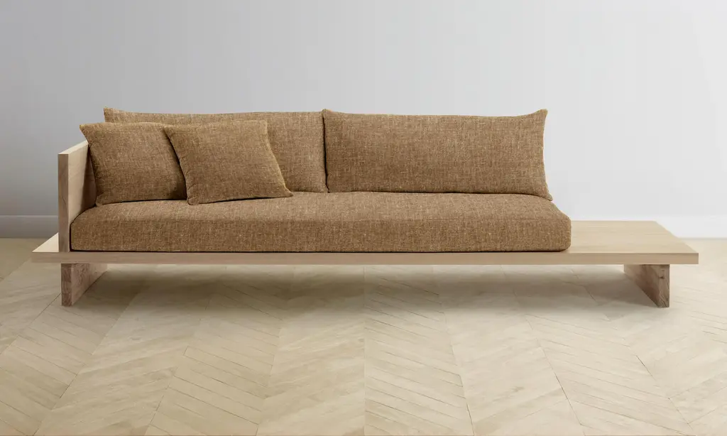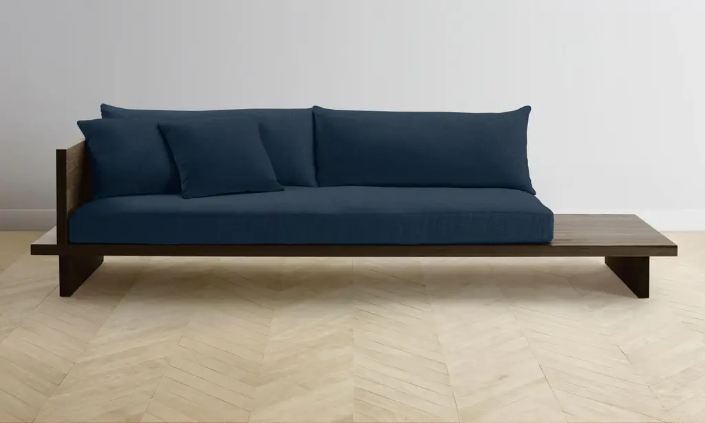 From the woodwork to the tailoring, every element of the Muir Sofa is a display of exquisite artisanship. Its angular frame extends beyond the seat cushion, allowing space for decorative objects or necessities. Handcrafted in North Carolina.